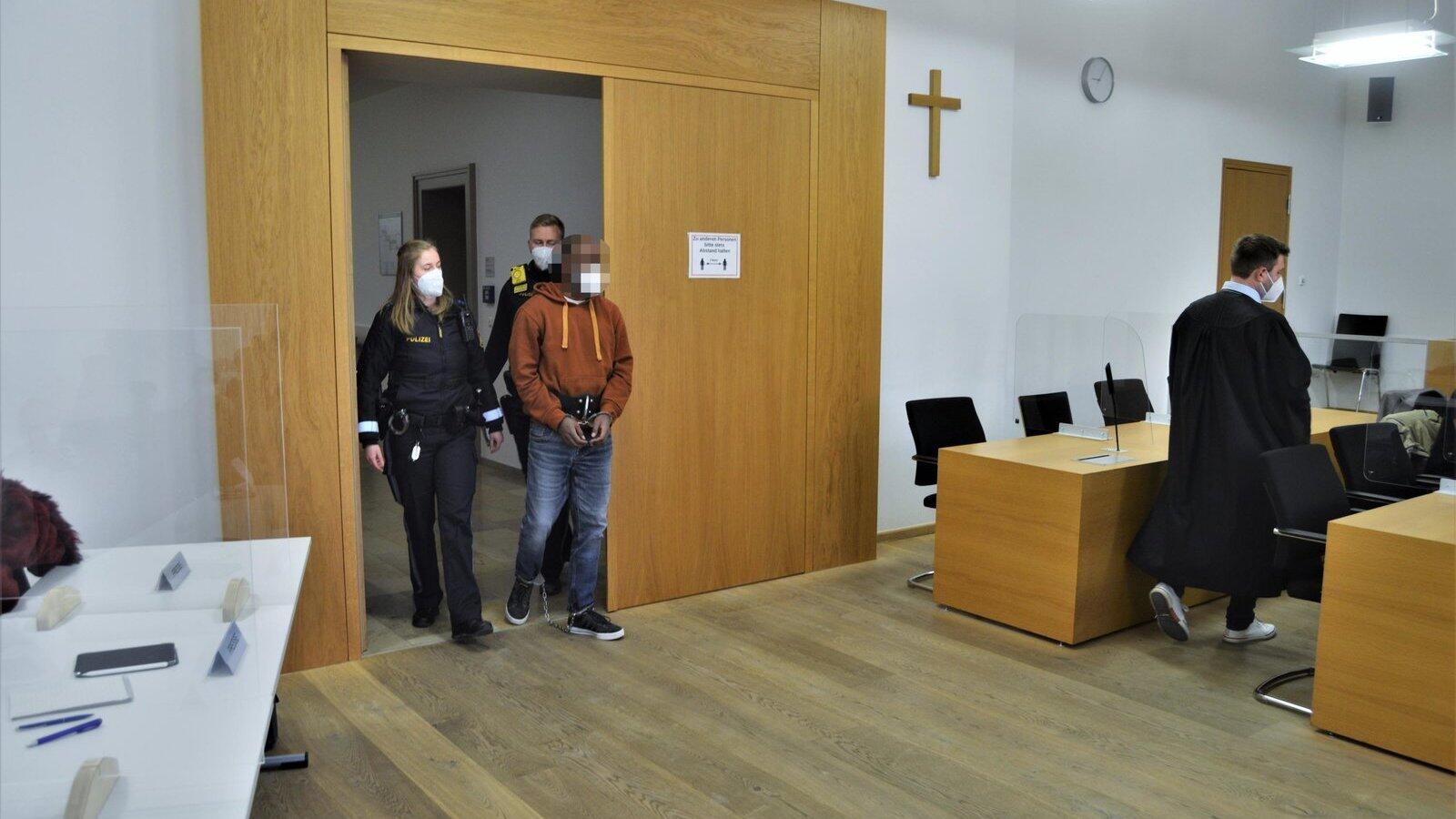 Zwei Beamte begleiteten den Beschuldigten der in Fuß- und Handfessel gelegt war in den Sitzungssaal am Landgericht Deggendorf.