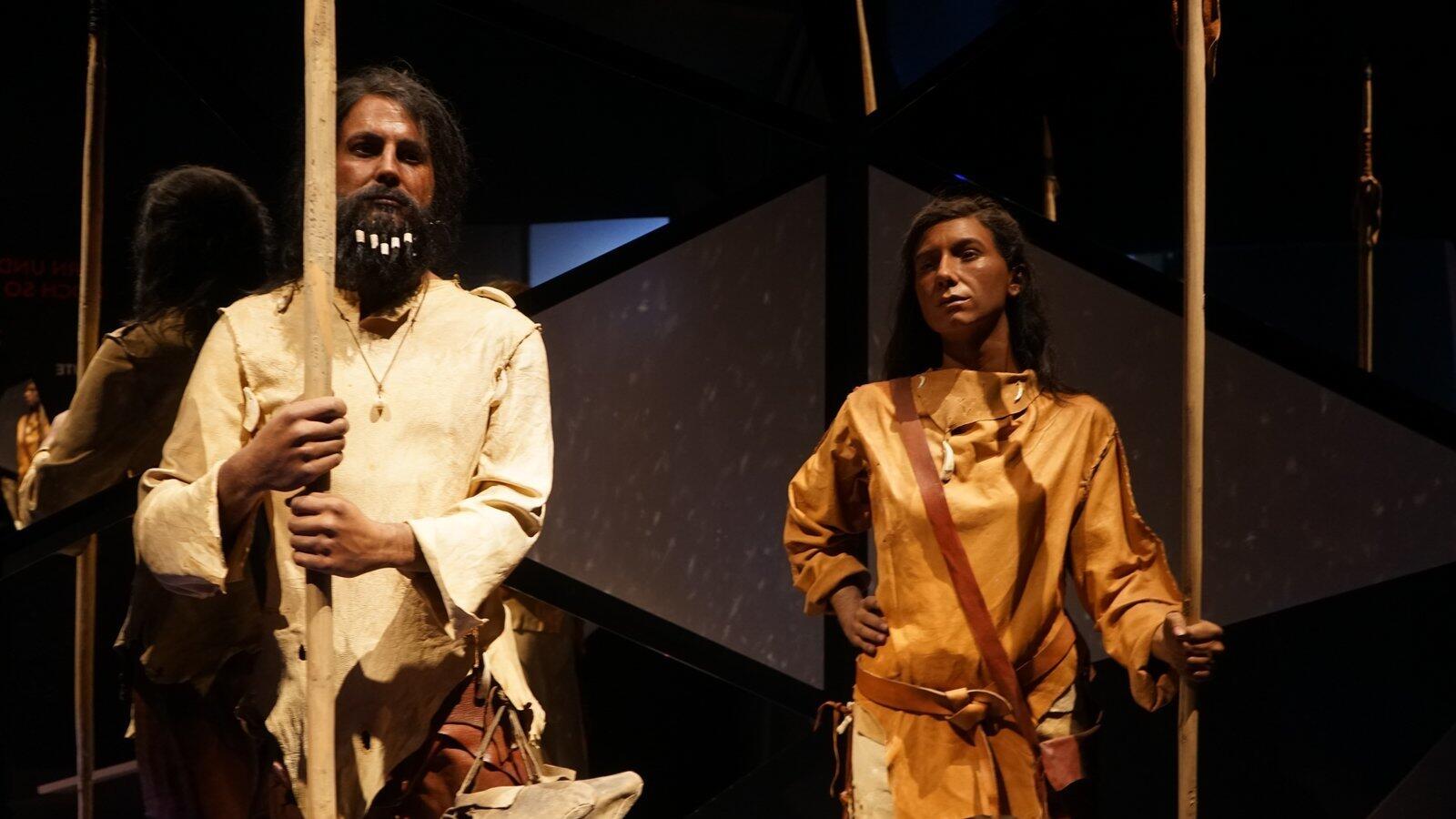 Die, wie man durch DNA-Analysen heute weiß, dunkle Haut der Jäger der Altsteinzeit erinnerte noch an Afrika, die Urheimat des Menschen, wie bei diesen beiden Modellen auf einer Eiszeit-Schau in Rosenheim.