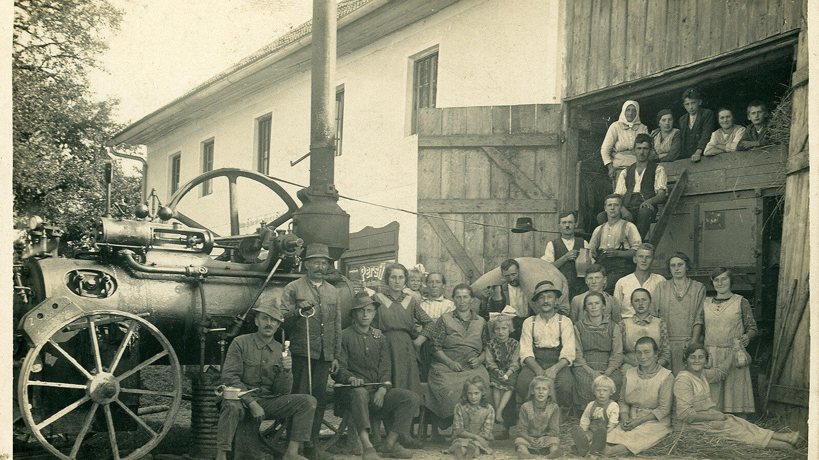 Bewegliche Dampfmaschinen waren für die Entwicklung der Landwirtschaft von großer Bedeutung. Hier präsentiert sich eine Gruppe von rund 20 Erntehelfern mit Kindern und Maschinisten stolz neben der Maschine. Das Foto wurde vom Landschaftsfotografen Georg Bayerl aus Ötzing bei Tiefenbach (Landkreis Passau) aufgenommen.
