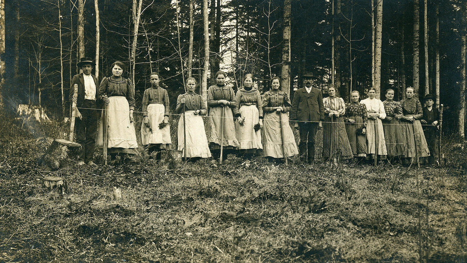 Die Ansichtskarte zeigt eine Gruppe von Frauen im Wald vor einer gespannten Schnur. Es handelt sich um Baumpflanzerinnen oder Kulturfrauen. Das Aufforsten war insbesondere durch die Abholzungen während der Kriege dringend nötig. Das Foto wurde vom Fotografen Ludwig Hirsch aus Waldkirchen (Landkreis Freyung-Grafenau) aufgenommen.