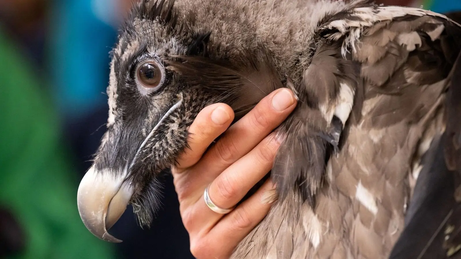 Ein Mitarbeiter im Nationalpark Berchtesgaden zeigt das Bartgeierweibchen Dagmar kurz vor der Auswilderung im Nationalpark Berchtesgaden.