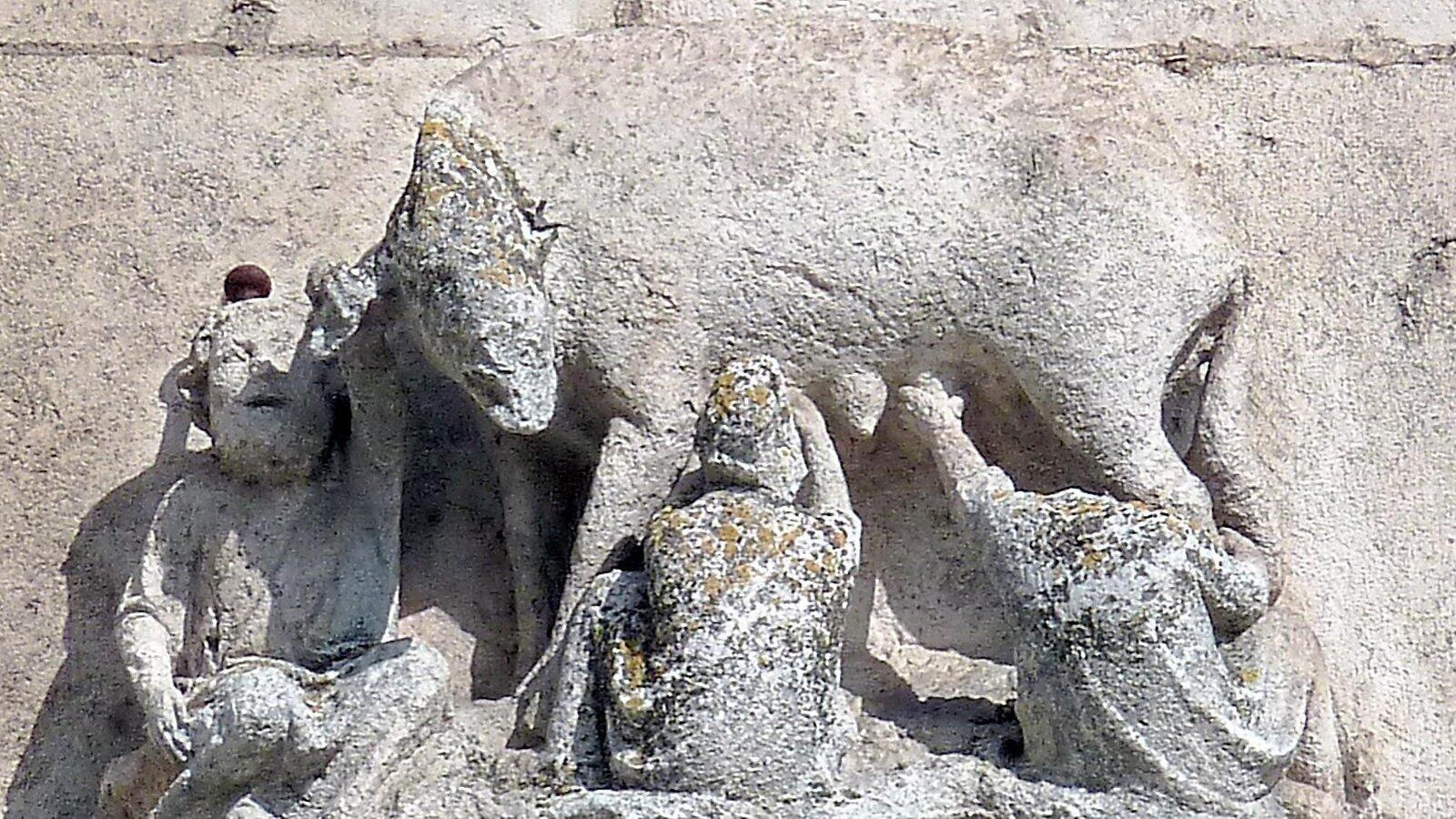 Ein Schwein, drei Männer, einer davon saugt an den Zitzen des Tieres - eine Figurengruppe unter vielen am Regensburger Dom, an dem sich allerlei steinerne Wesen tummeln.