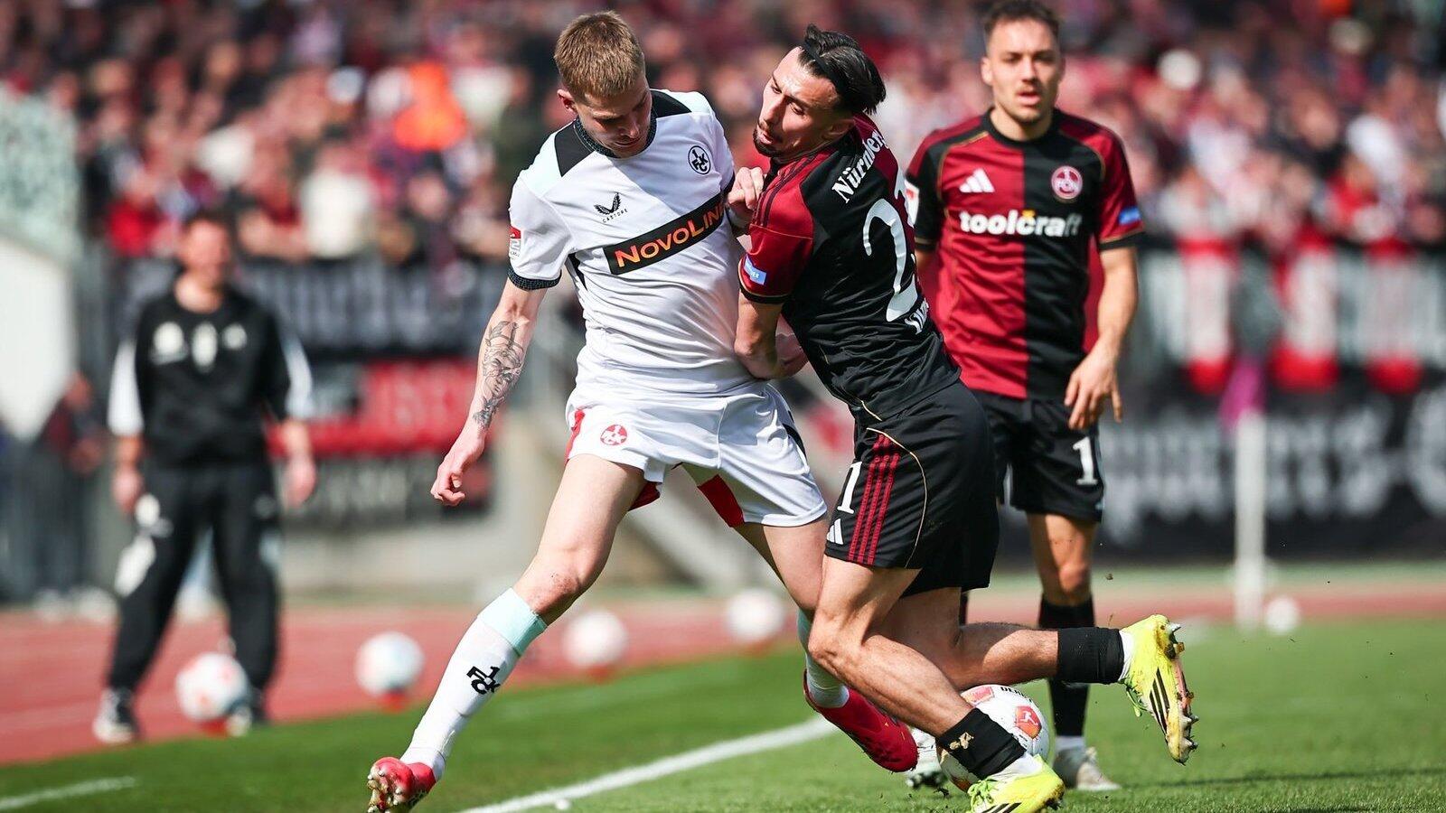 Nürnbergs Berkay Yilmaz (rechts) kämpft gegen Kaiserslautern-Profi Paul Joly um den Ball.