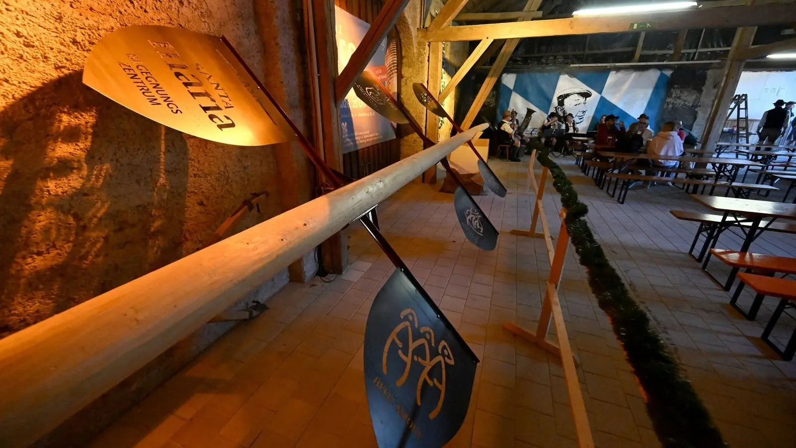 Entsprechend ist der Maibaum auch optisch etwas anders als übliche Maibäume. Nicht wie oft in Oberbayern weiß-blau lackiert, sondern nur gehobelt. Und statt Zunftzeichen oder Vereinswappen zeigen die sechs Schilder aus Cortenstahl die gelaserten Logos verschiedener kirchlicher Einrichtungen und Institutionen. Oben auf der Spitze thront der Heilige Korbinian, der Bistumspatron, mit dem Freisinger Bären.