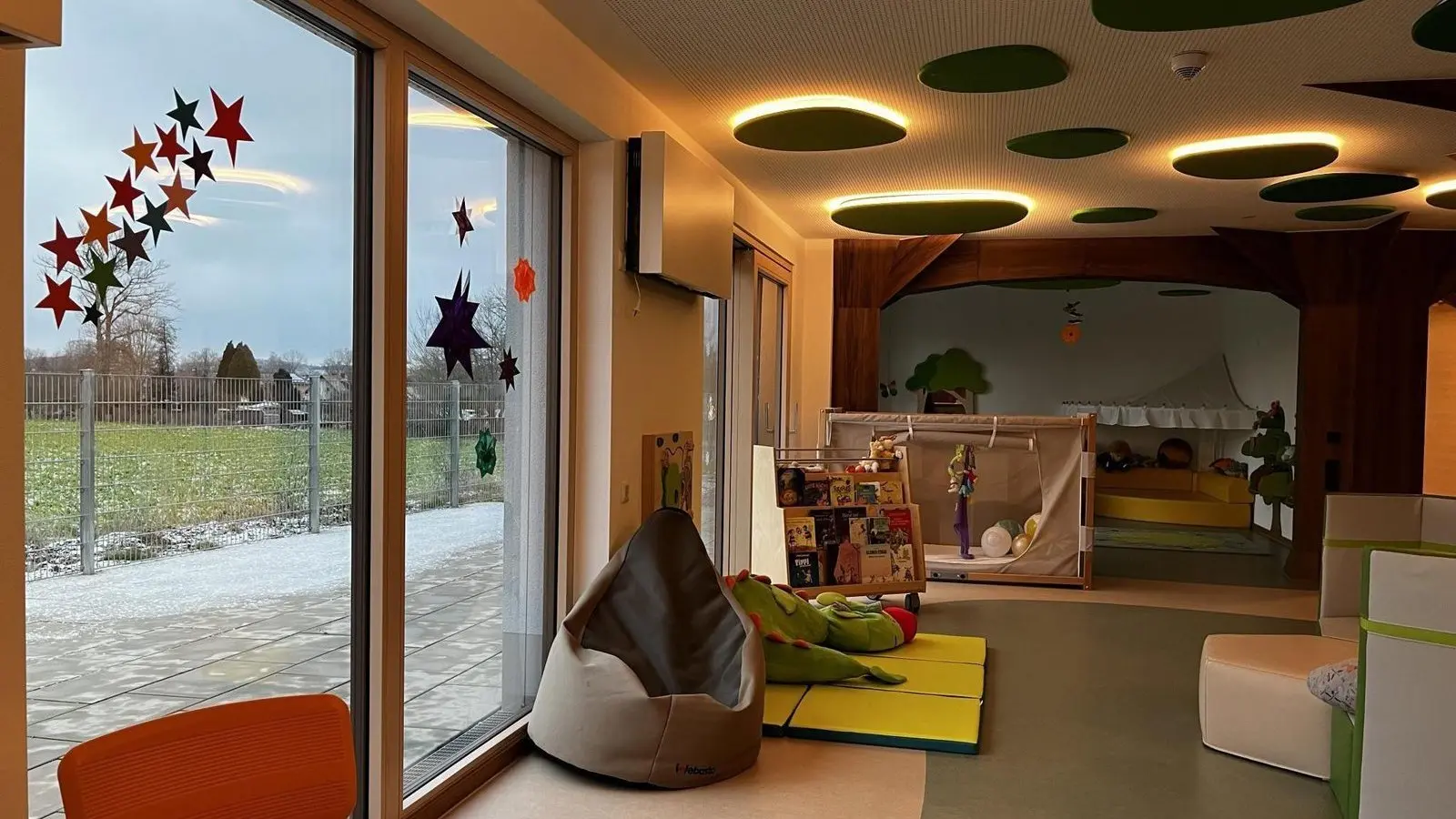 Der Gemeinschaftsbereich ist ein offener Raum mit Küche, drei runden Tischen, einer Spielecke und Polstermöbeln. Ein großer grüner Drache lädt zum Kuscheln ein, eine Wassersäule macht blubbernde Geräusche und Bilderbücher von Lauras Stern und Pippi Langstrumpf stehen in einem Bücherregal bereit zum Schmökern.