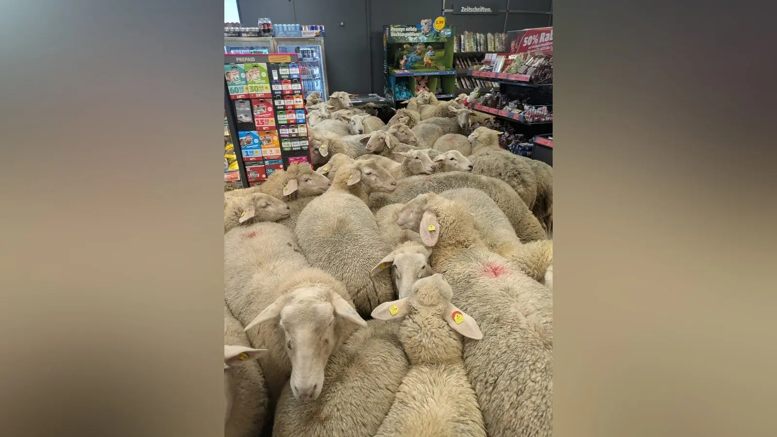 Tierischer Besuch in einem Supermarkt in der unterfränkischen Gemeinde Burgsinn: Rund 50 Schafe sind schnurstracks in eine Filiale des Discounters Penny marschiert und haben sich etwa 20 Minuten lang zwischen Regalen im Kassenbereich aufgehalten, wie ein Unternehmenssprecher am Dienstag mitteilte.