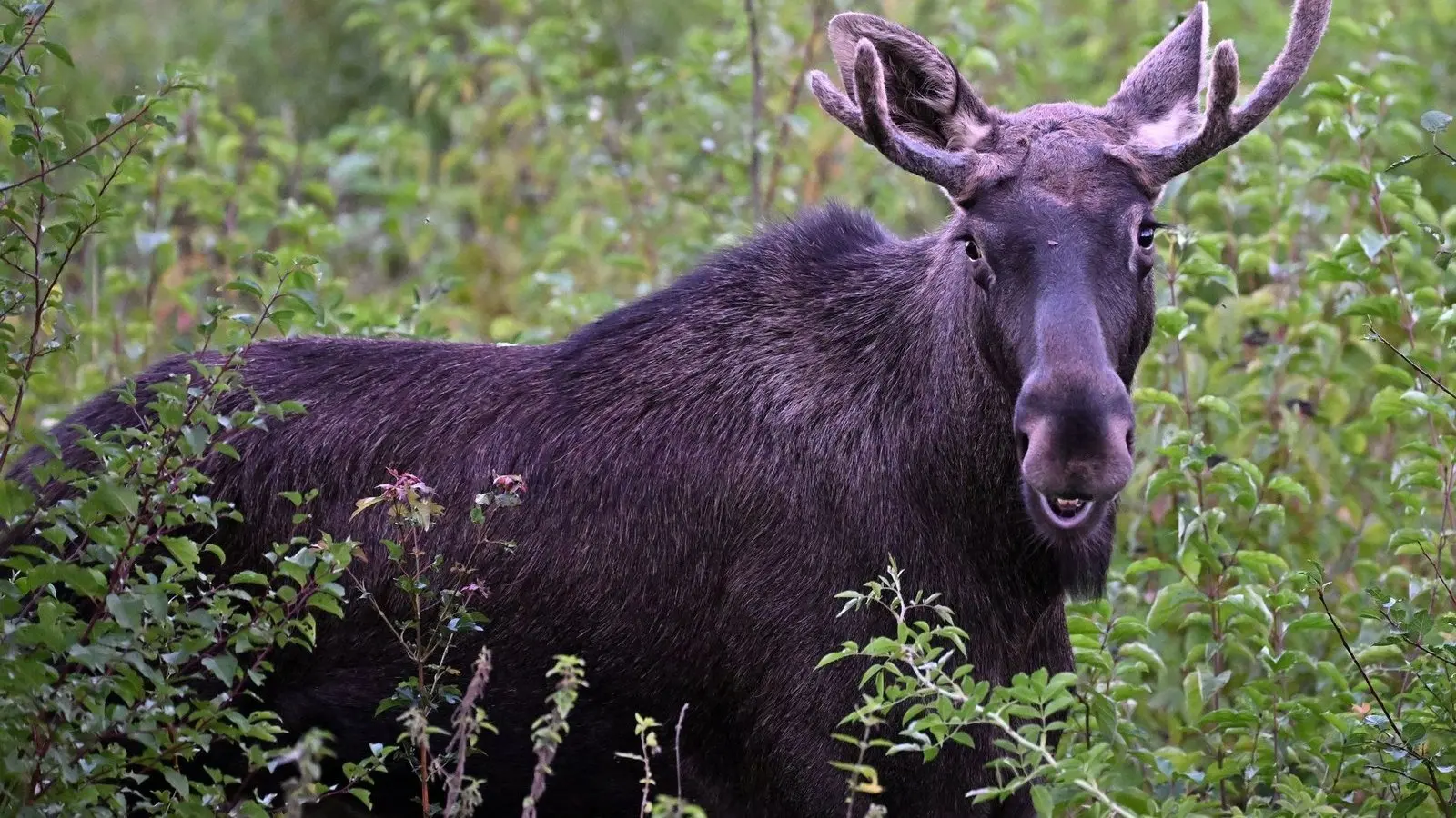 Elch Emil steht zwischen Büschen. Diese Aufnahme wurde im vergangenen September in Österreich gemacht. (Archivbild)