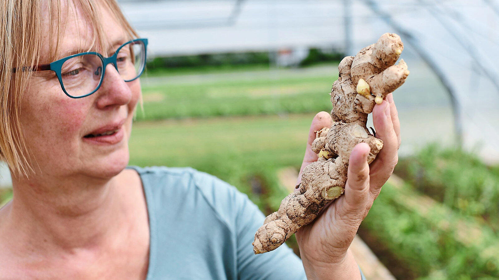 Birgit Rascher steht mit einer Ingwerknolle aus der Vorjahresernte in einem Folientunnel-Gewächshaus der LWG.