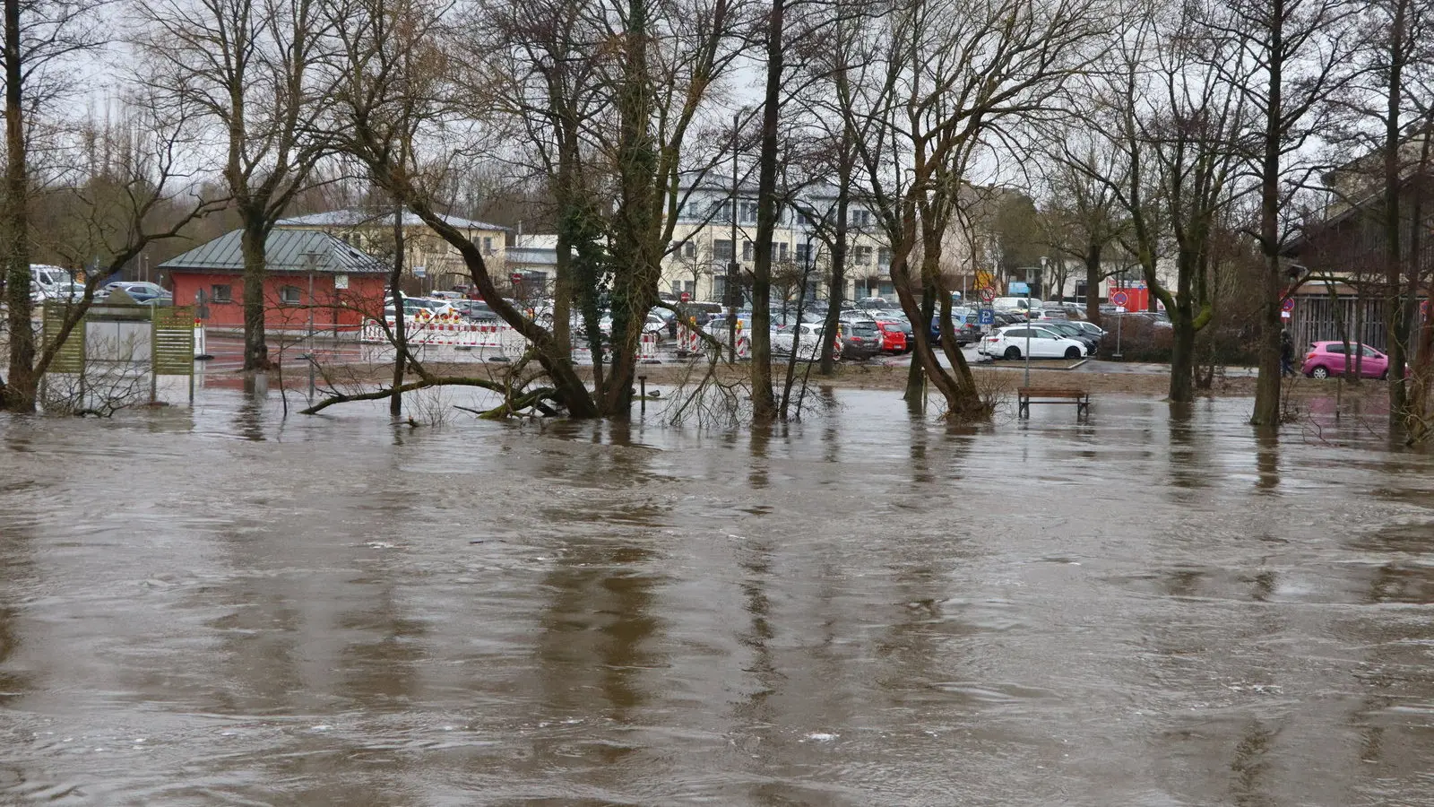 In Cham tritt der Regen über die Ufer und bedroht mehrere Parkplätze in Ufernähe.