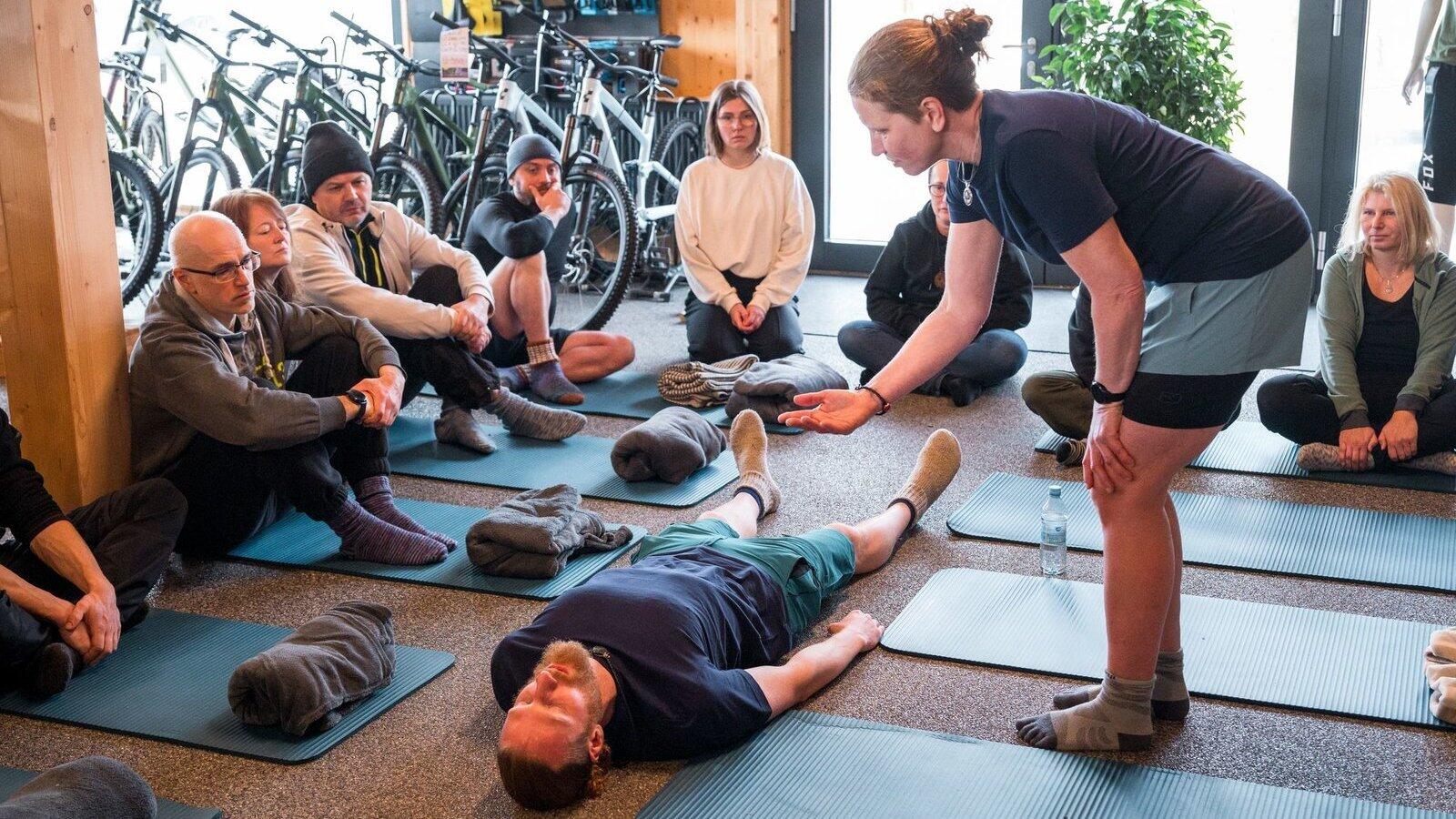 Vor der Wanderung hat sich die Gruppe in einem geschlossenen Raum etwa zwei Stunden lang seelisch und körperlich vorbereitet. Von vier Coaches angeleitet, trainieren die Teilnehmenden auf Yogamatten bei meditativer Musik die sogenannte Wim-Hof-Atmung, die sie gegen die Kälte wappnen soll. Bevor die Gruppe los wandert, folgt eine Meditationseinheit.