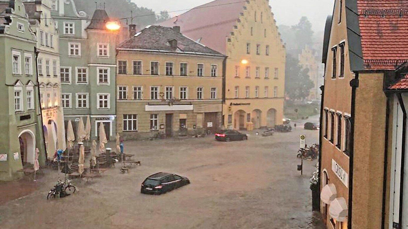 In Landshut war der Regen so stark, dass innerhalb von wenigen Minuten die Altstadt überflutet wurde. Fahrzeuge hatten sichtlich Mühe, sich durch die Fluten zu kämpfen.