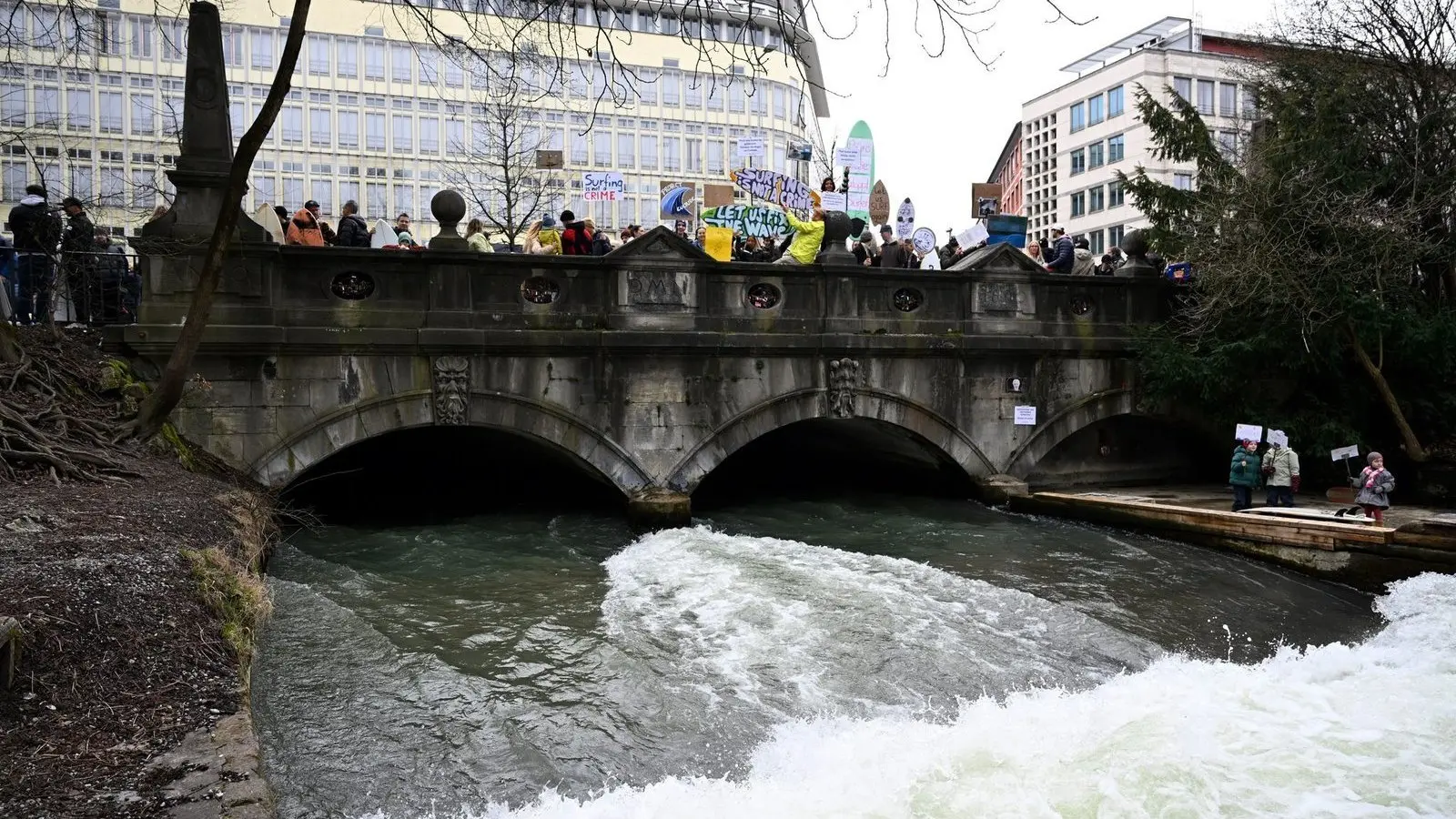 Anfang März fand eine Demonstration gegen das derzeit geltende Surfverbot auf der Eisbachwelle statt. (Archivbild)