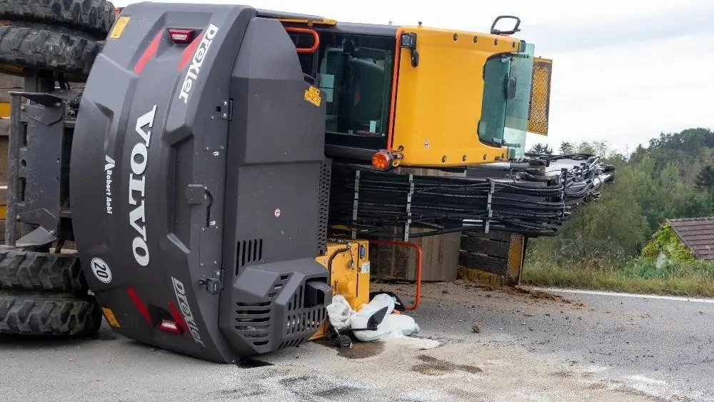 Lkw-Anhänger umgekippt, Bagger landet auf der Straße