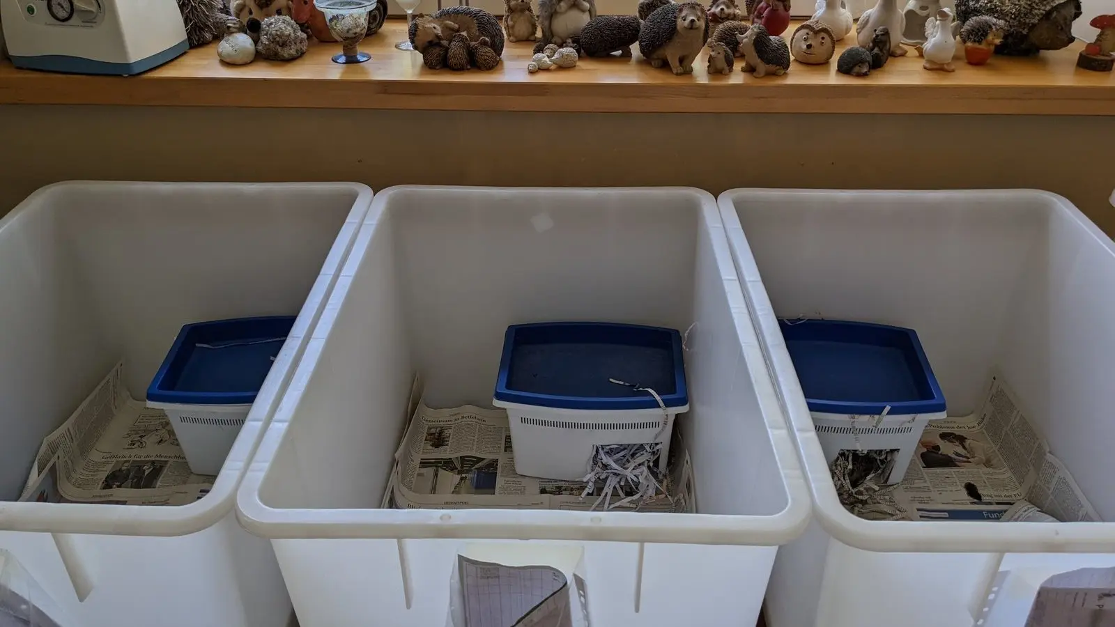 In Lüdtkes Haus lässt sich hin und wieder ein leises Rascheln vernehmen. Jeder Igel bekommt eine weiße Kiste, die mit Zeitung ausgelegt ist, und ein mit geschredderter Zeitung gepolstertes Haus aus Karton, das als Unterschlupf dient.