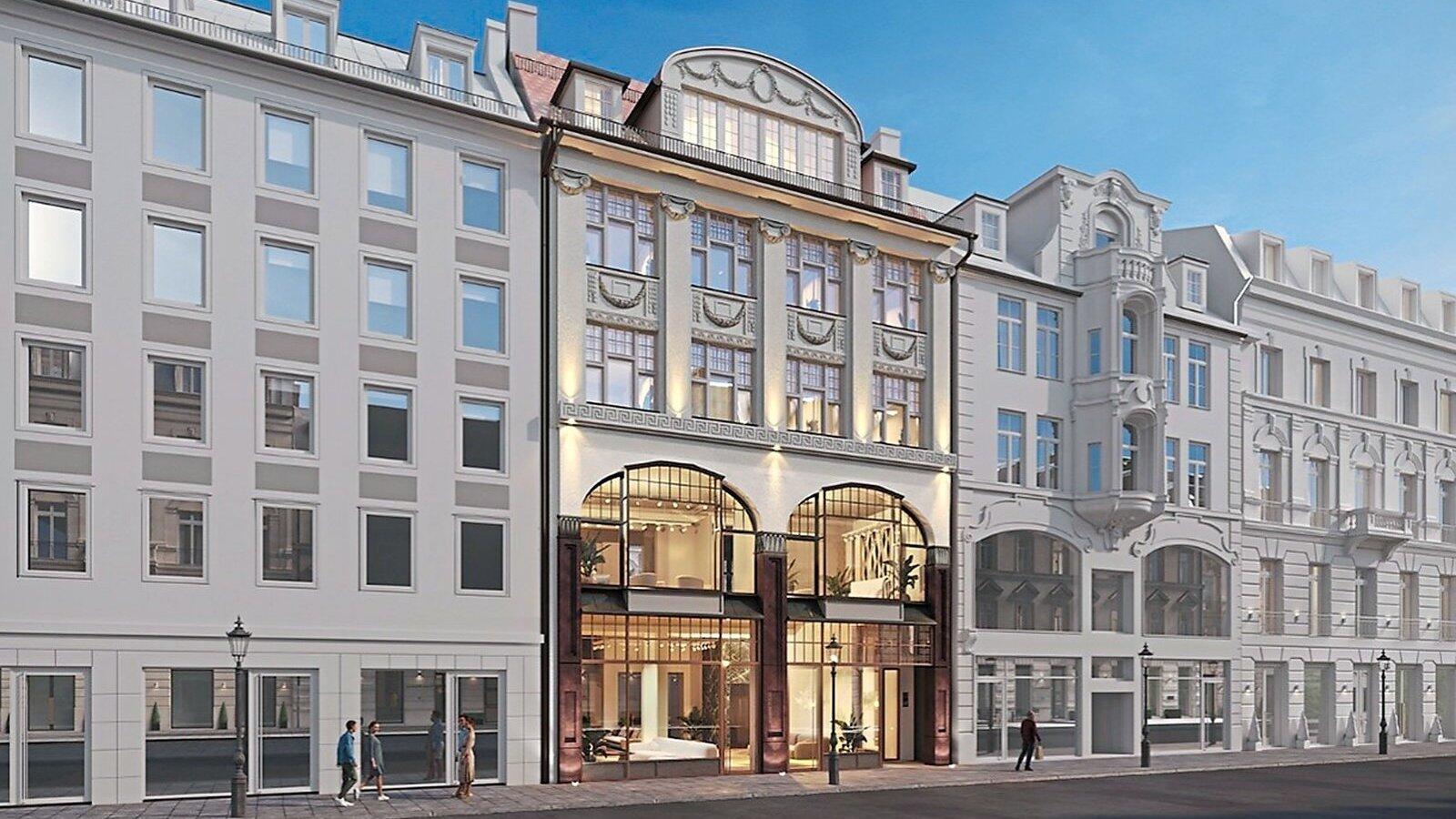 So nobel soll das Gebäude von Heilmann und Littmann in der Residenzstraße 24 wieder werden. Die im Krieg zerstörte Tonnengaube im Dachgeschoss ist zum Teil schon wiederhergestellt. Direkt gegenüber ist die Residenz.