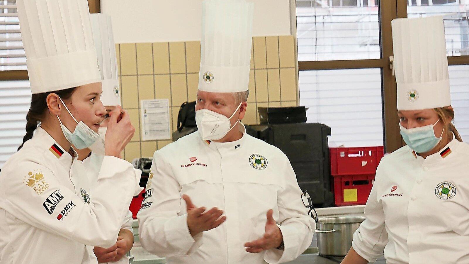 Der Löffel wird beim Training der Köche der Nationalmannschaft oft gezückt: Die Trainer Elisabeth Albrecht (v. l.) und Mike Wieser sprechen mit Team-Kapitänin Anne Kratz über ein Gericht. Was genau die Köche zubereitet haben, dass muss bis zur Weltmeisterschaft ein Geheimnis bleiben.