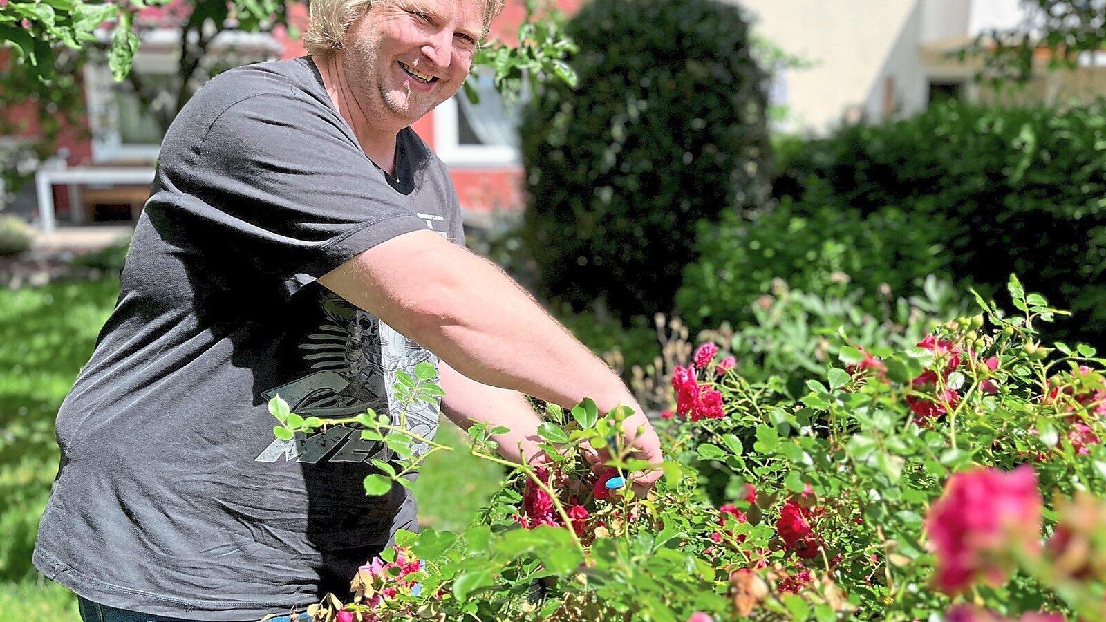 Holger Zimmert steht in seinem Garten in Tirschenreuth. Der 46-Jährige atmet tief durch, während er einen Rosenstrauch zurückschneidet.