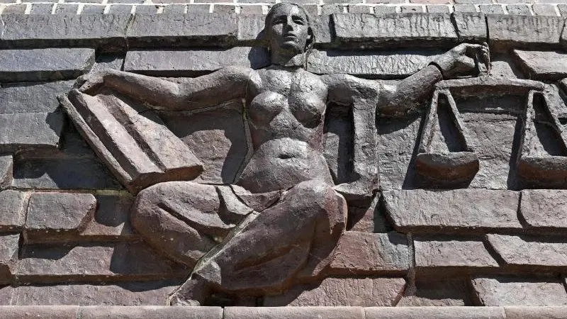 Blick auf die Justitia über dem Eingang eines Landgerichts.