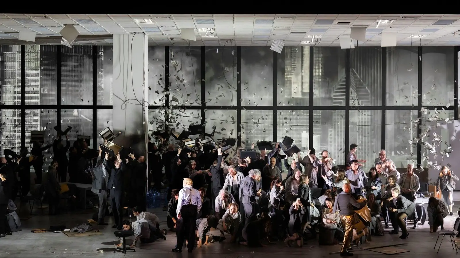 "Das heißt, ich gehe von der dystopischen Zukunft, die ich im dritten Akt in brennenden Büro-Türmen inszeniere, nahtlos über in die Zerstörung, die herrschte, als Strauss das Stück schrieb. Die Zeit heute ist der damaligen ja nicht so unähnlich. Man hat jetzt manchmal Gänsehaut und denkt: "Moment mal. Genau so fing irgendetwas schon mal an.""