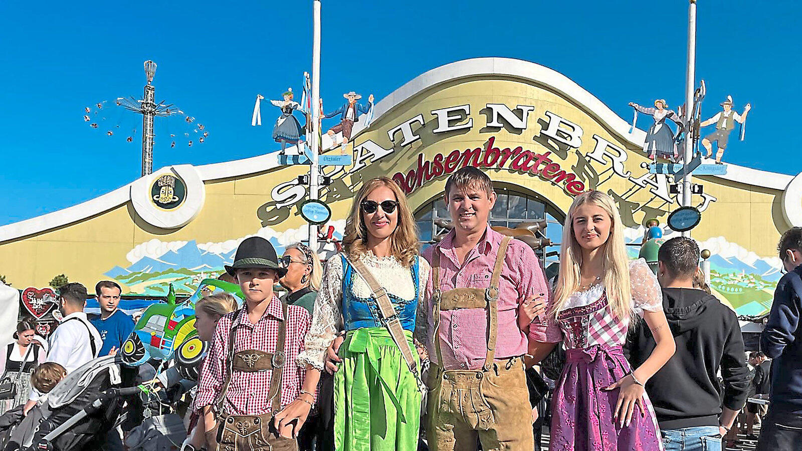 Auf die Wiesn wollten sie unbedingt in Tracht gehen (v.l.): Die Ukrainer Daniil, Halyna, Mykhailo und Dania Ustynovska stehen vor der Ochsenbraterei auf der Theresienwiese.