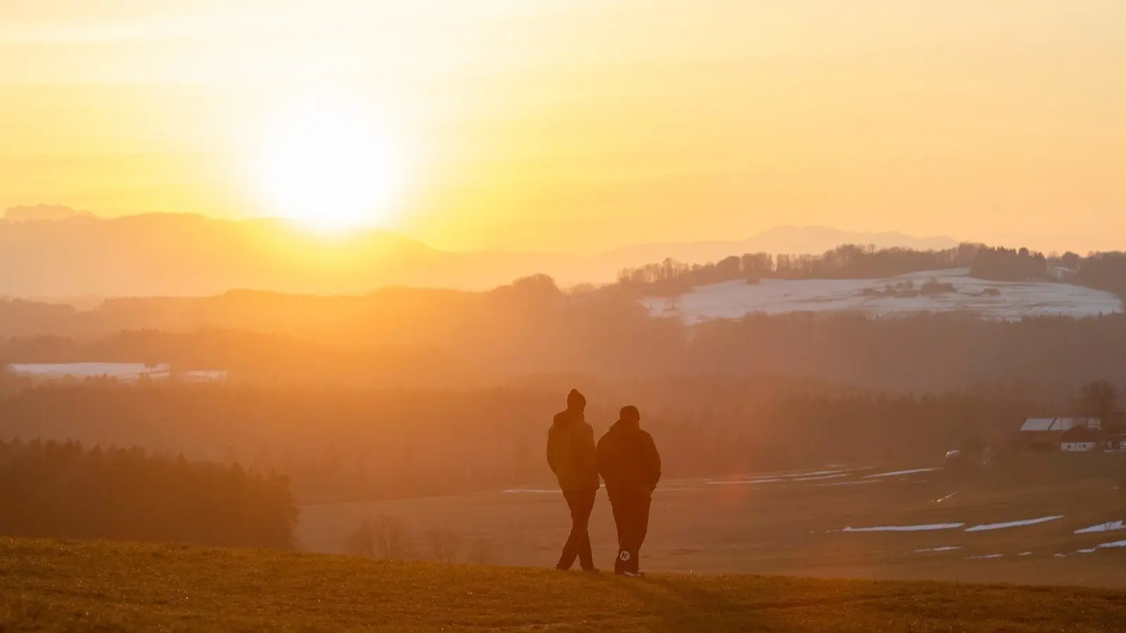 Zwei Männer gehen bei Sonnenuntergang über eine Wiese auf dem Irschenberg. Das Wochenende in Bayern soll wieder sonnig werden.