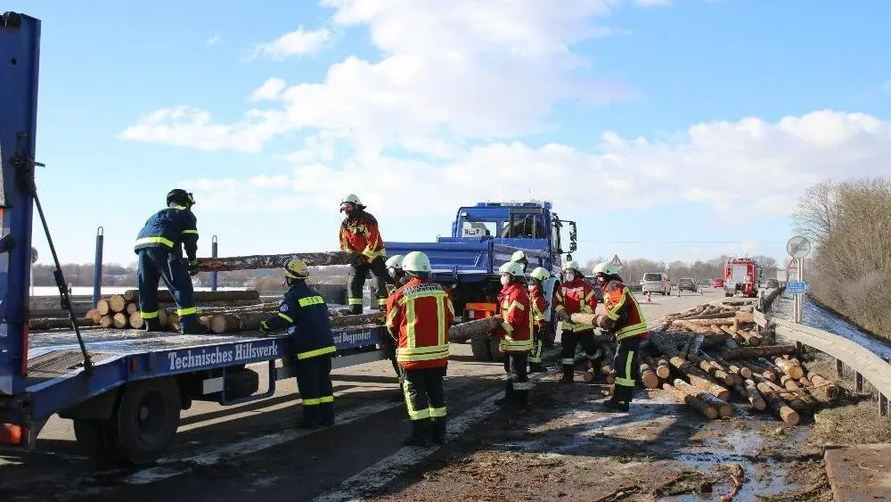 Bei der Ladung handelte es sich um etwa drei Meter lange Baumstämme. Dieses Schlamassel musste natürlich erst einmal wieder beseitigt werden. Und dafür mussten die Feuerwehren aus Hengersberg und Iggensbach sowie das THW ordentlich anpacken. Gegen 15 Uhr waren schließlich sämtliche Baumstämme von der Fahrbahn beseitigt.