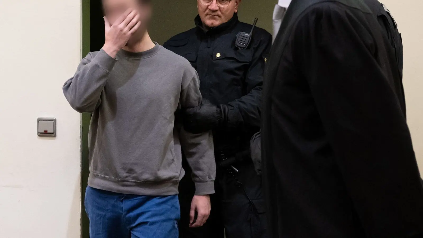Der Angeklagte wird in den Verhandlungssaal geführt. Laut Anklage hatte der Mann 2021 in dem Fernzug Passau-Hamburg vier Männer angegriffen und mit einem Messer zum Teil schwer verletzt.