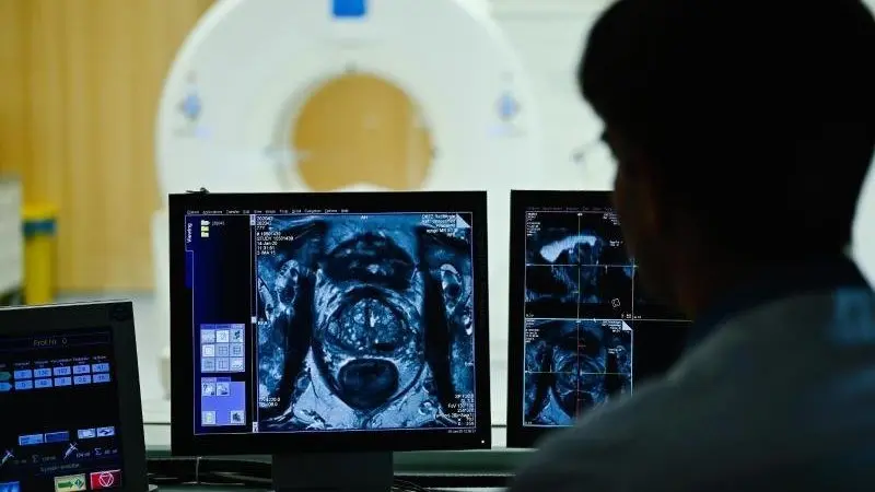 Ein Mitarbeiter betrachtet in einem Kontrollraum des Deutschen Krebsforschungszentrum (DKFZ) auf einem Monitor das Querschnittsbild einer Prostata.