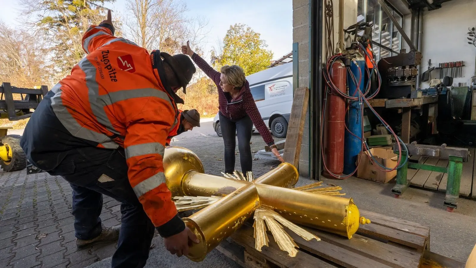 Angekommen im Tal, wurde das Kreuz auf einem Anhänger in die Werkstatt der Kunstschmiedin Andrea Würzinger nach Eschenlohe gebracht, deren Vater das Kreuz 1993 gebaut hat. Dort soll die dicke Schicht Aufkleber vorsichtig entfernt, der Untergrund geschliffen sowie Lack und neues Blattgold aufgebracht werden.