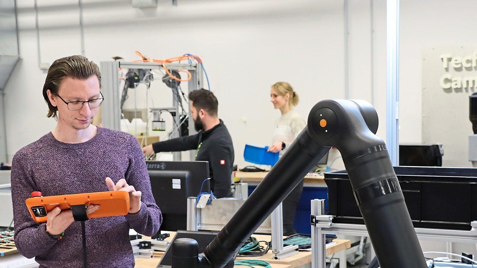 Ein junger Forscher programmiert einen Roboter am Campus in Cham. Künftig soll der Bereich "intelligente Robotik" dort eine noch größere Rolle spielen.