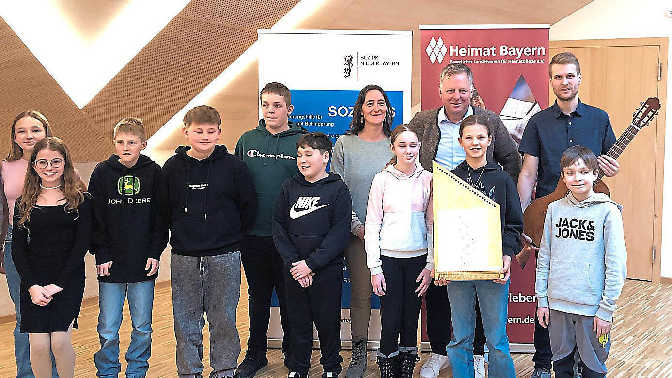 Dominik Hilgart, Rudolf Neumaier, Veronika Keglmaier (hintere Reihe v. r.) und die Schüler der Realschule Freyung sind von dem Projekt begeistert.