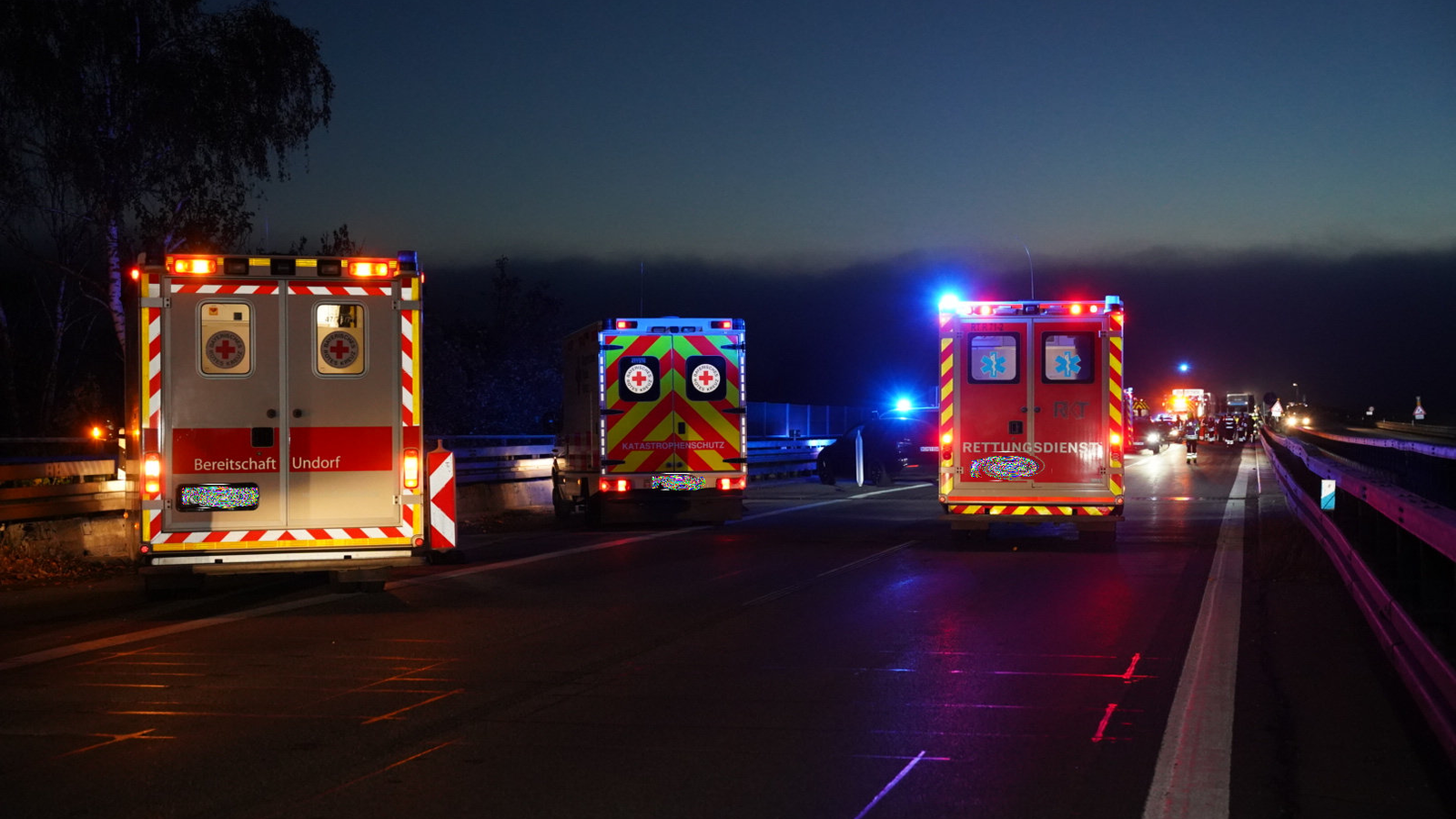 An dieser Unfallstelle waren Feuerwehren aus der Umgebung und ein Großaufgebot des Rettungsdienstes eingesetzt. Insgesamt wurden 22 Personen ärztlich untersucht und von den sieben leichtverletzten Personen vier Unfallbeteiligte ins Krankenhaus gebracht.