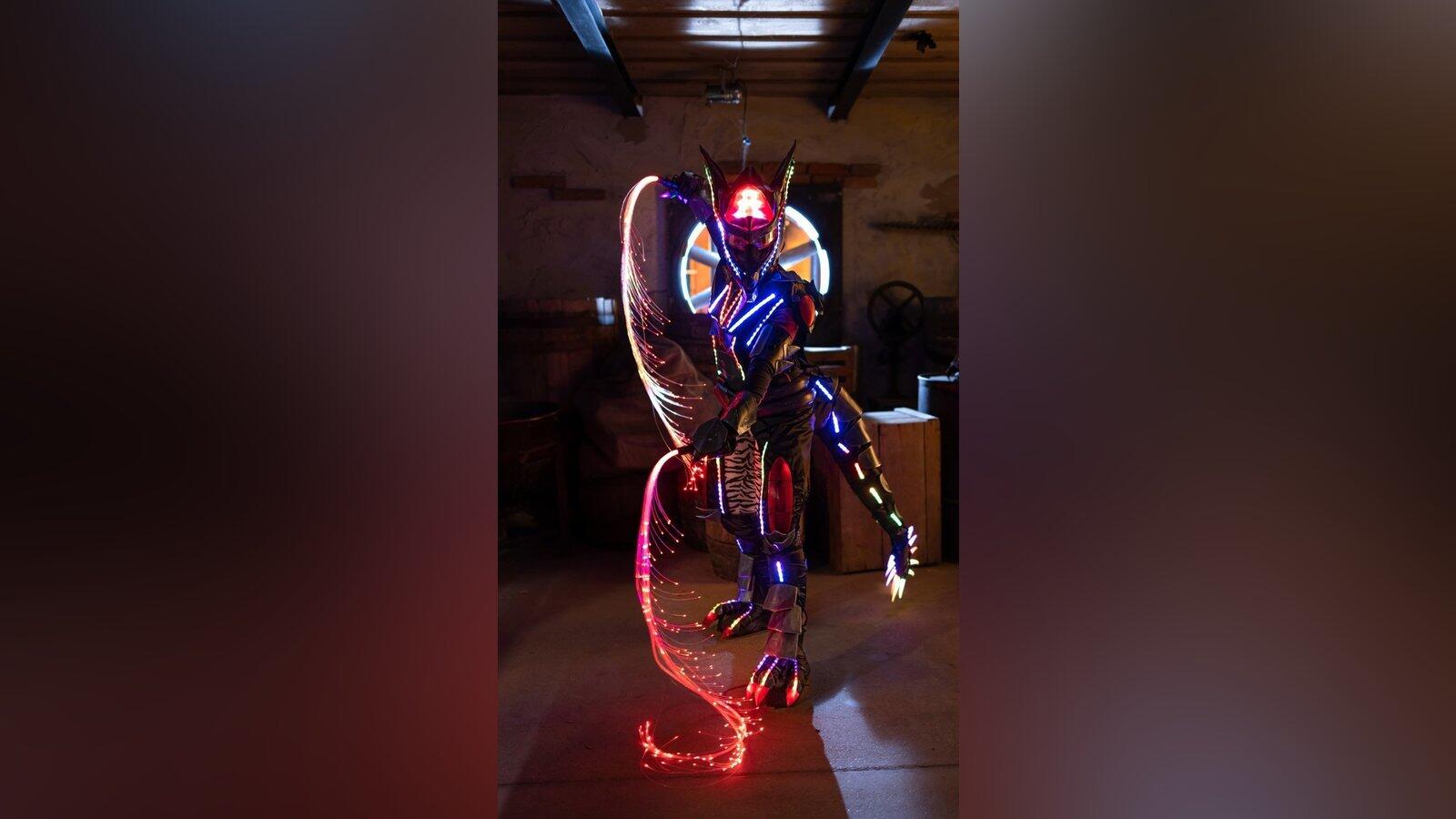 Dann ist der Anzug fertig. Was als eine Idee, Skizzen und Pläne angefangen hat, wird zu einem tragbaren Drachen-Cosplay. Die Entstehung kostet mehrere Hundert Stunden Arbeit und jeder Anzug von Tina hat abweichende Elemente. Manche besitzen zum Beispiel mehr Technik, nutzen andere Farben oder komplexere Bautechniken.