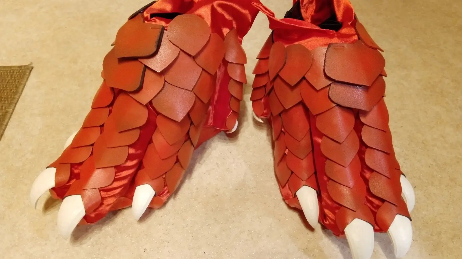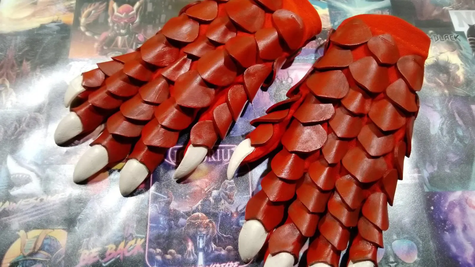 Die Hände sind der einfachste Teil des gesamten Anzugs. Tina befestigt Krallen aus ihrem 3D-Drucker zuerst an einem gewöhnlichen Paar Handschuhe und kümmert sich als Nächstes wieder um die einzelnen Schuppen. Diese sind übrigens aus schwarzem Moosgummi geschnitten. Auf der Handinnenseite malt Tina die Schuppen nur an, damit der Mensch in dem Cosplay weiter ohne Probleme zugreifen kann.