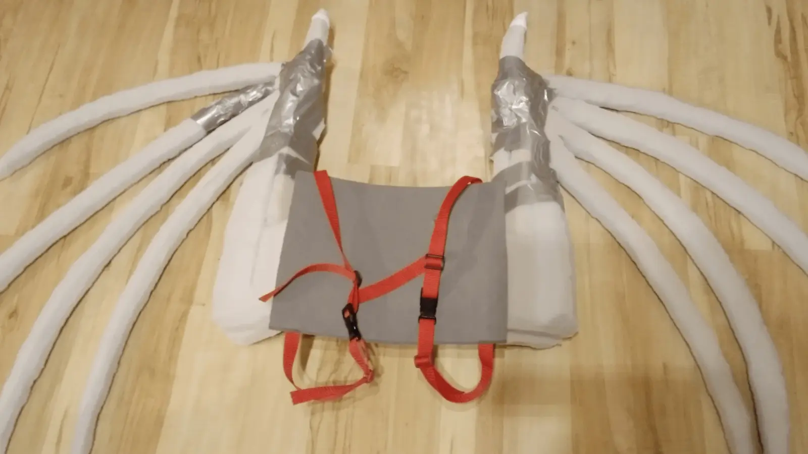 An beiden Seiten zieht Tina den Stoff über den Schaumstoff und beklebt dann alles wieder mit Schuppen. Durch den Kern sind die Flügel übrigens sehr flexibel und lassen sich ohne Probleme mit Gurten anbringen, ohne zu brechen.