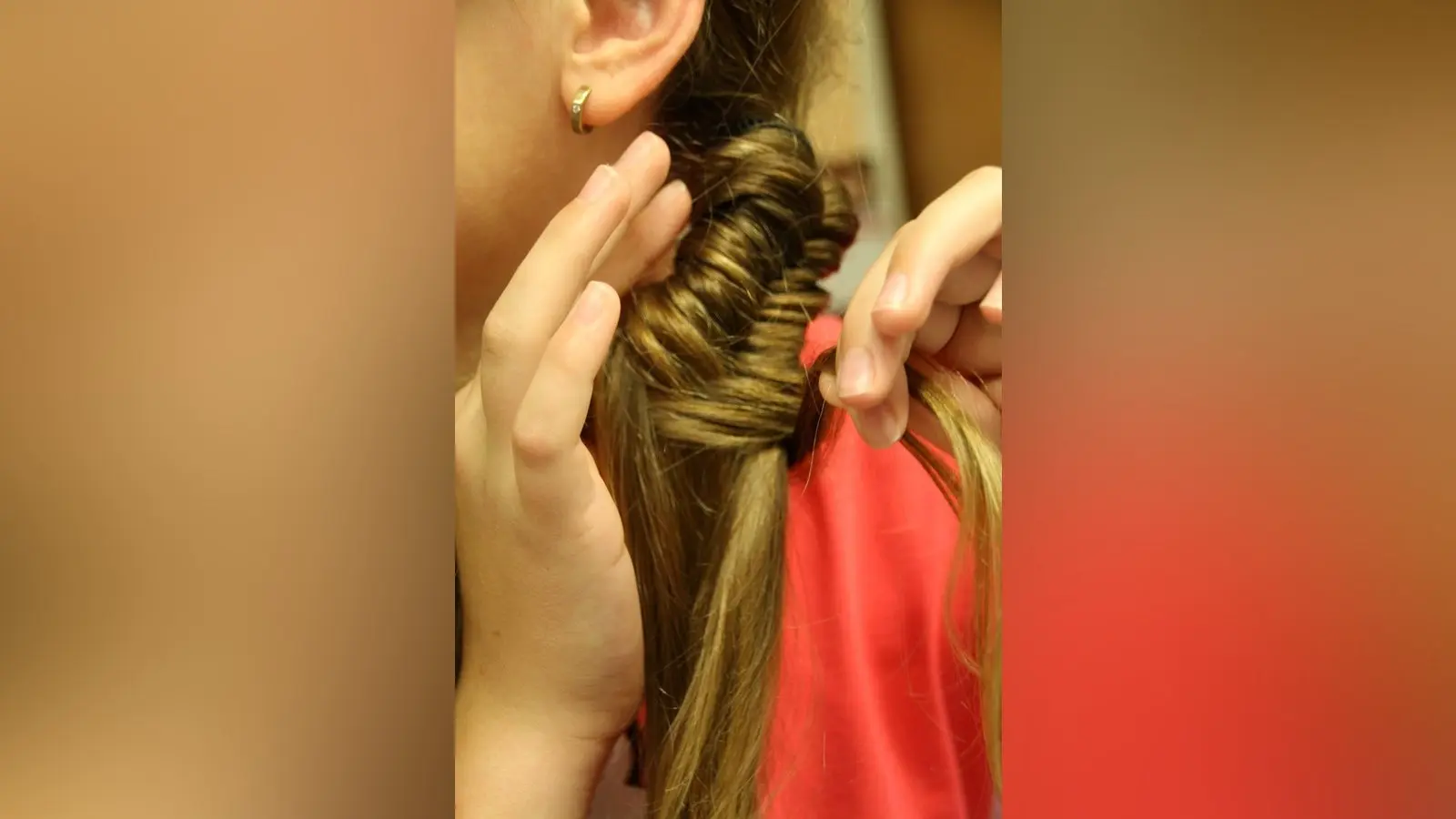 2. Dann flicht sie einen Fischgrätzopf: Dazu teilt sie ihren Zopf in zwei Partien. Von der rechten Partie nimmt sie von hinten eine dünne Strähne auf, legt sie über die rechte Partie auf die andere Seite und lässt sie dort hängen. Dann nimmt sie eine Strähne von der linken Seite und legt sie über diesen Strang zur rechten Partie. Auf diese Art fährt sie fort, bis sie bei den Haarspitzen angelangt ist. Dazwischen zieht sie den Zopf immer wieder fest. Das Ganze braucht ein bisschen Übung. Am besten zuerst einmal bei einer Freundin ausprobieren. Es gilt: Je dünner die Strähnen, umso schöner!