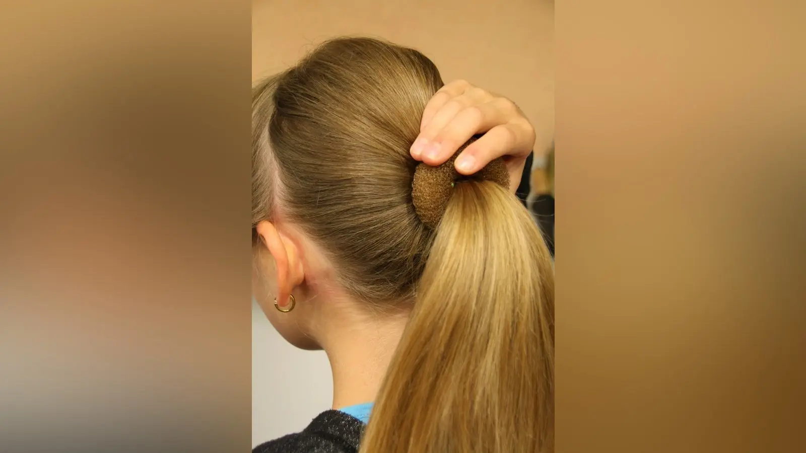 2. Dann schiebt sie ein Duttkissen über den Pferdeschwanz und toupiert ihre Haare leicht an.