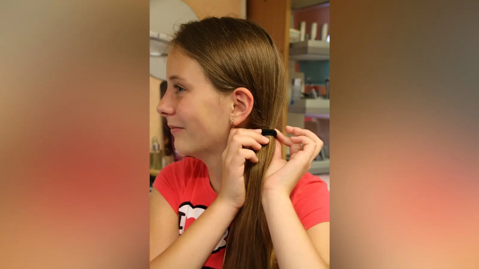 1. Leonie bindet ihre Haare zunächst mit einem Gummi zu einem Pferdeschwanz auf mittlerer Höhe zusammen. An der Seitenpartie lässt sie eine dickere Strähne aus, diese wird später gekordelt.