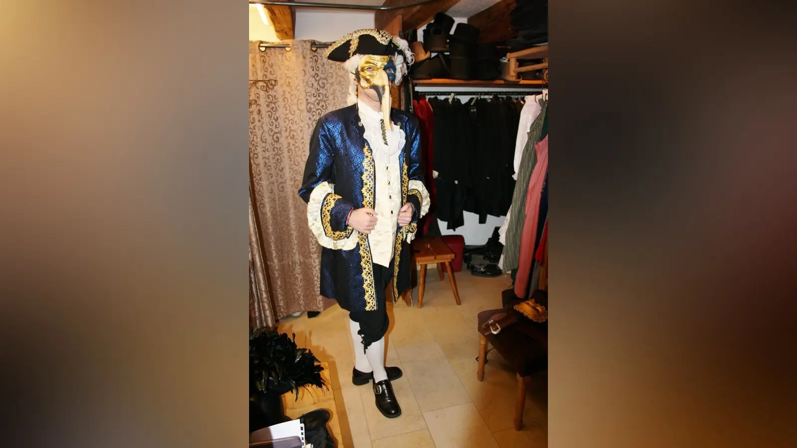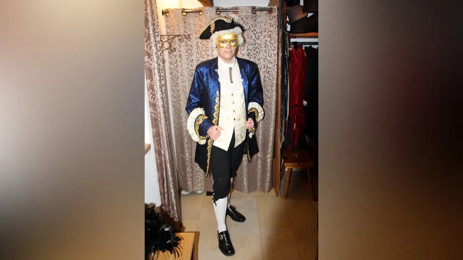 Weil Venedig eine der Faschings-Hochburgen ist, spielen venezianische Kostüme immer eine große Rolle. Mit einem blauen Gehrock, Kniebundhosen und Dreispitz verwandelt sich der 18-Jährige vom Franz zu einem barocken Marquis.