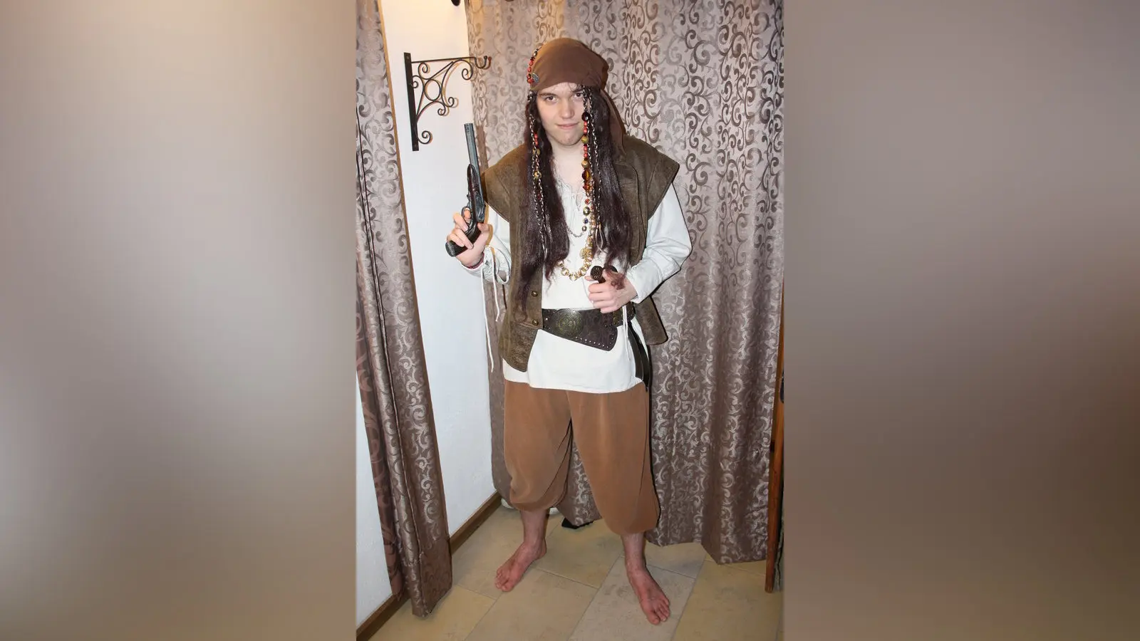 Patricks Kostüm wird noch mit Jack-Sparrow-Perücke, segelfester Weste und Pistole aufgepeppt. Schuhe braucht ein Freibeuter, der was auf sich hält, für ein Foto natürlich nicht.