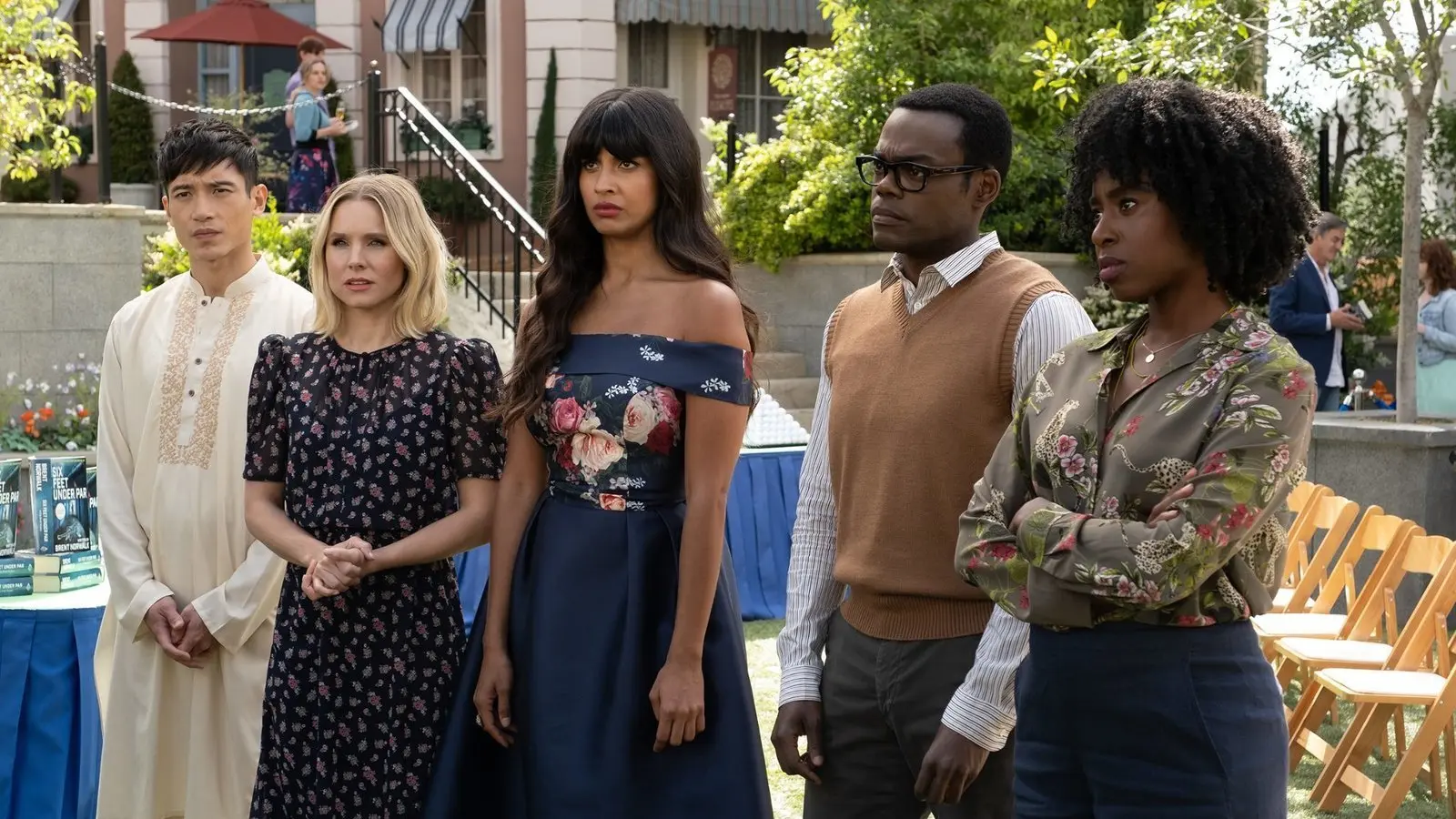 In der Sitcom "The Good Place" muss sich Eleanor (Zweite von links) in ihrer neuen Nachbarschaft im Himmel zurechtfinden.