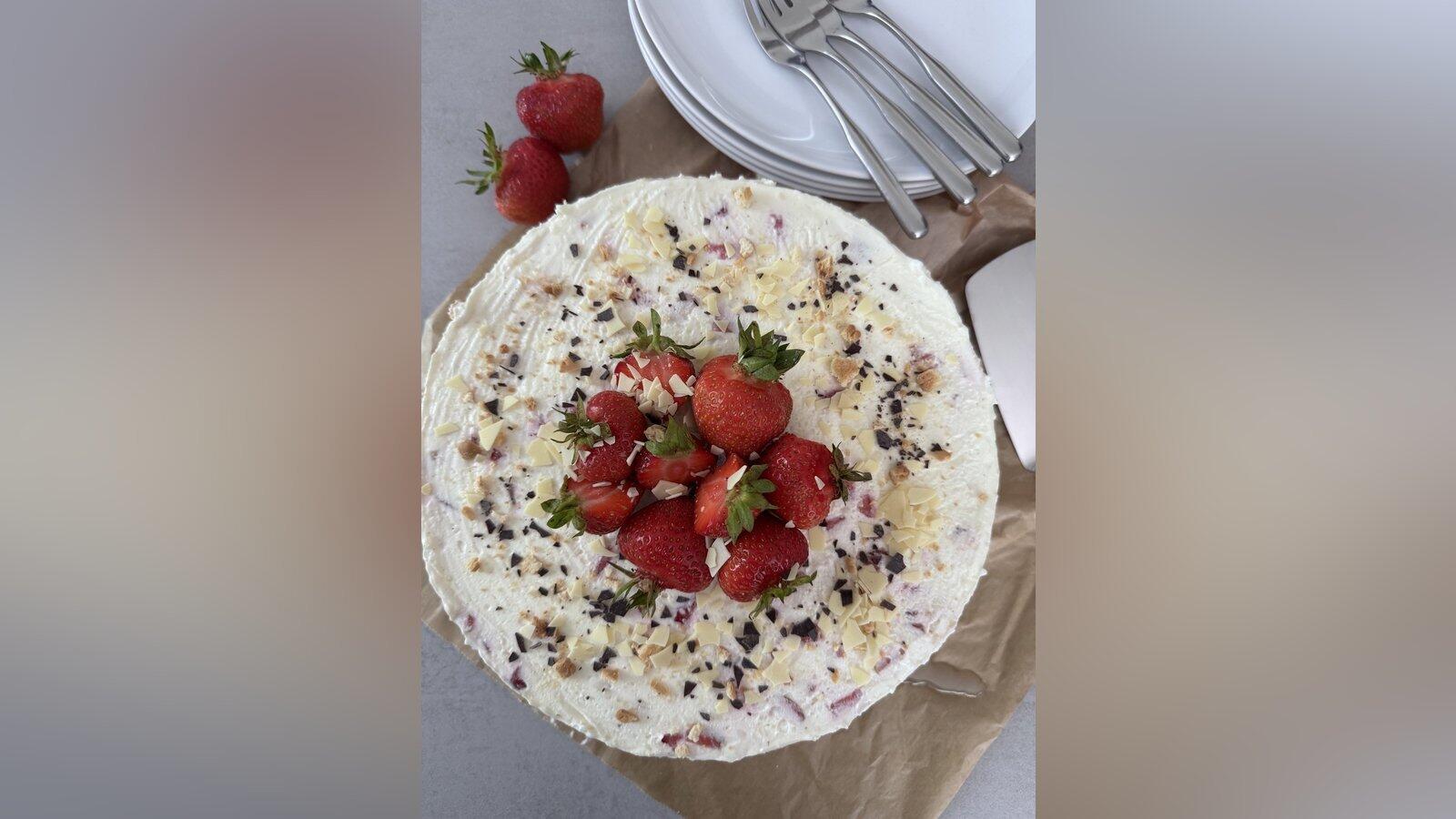 Für den Boden geschmolzene Butter mit Butterkeksen mixen und in eine Springform drücken. Für die Käsekuchenmasse Milch, Joghurt, Stärke und Zucker in einem Topf erhitzen, bis eine dickere Masse entsteht. Abkühlen lassen, derweil weiße Schokolade schmelzen und Sahne mit Sahnesteif aufschlagen. Anschließend Frischkäse, Vanillepaste, Joghurt und weiße Schokolade verrühren, bevor die kalte Joghurtmasse folgt. Schlagsahne und 600 Gramm klein geschnittene Erdbeeren unterheben, auf dem Keksboden verteilen und glatt streichen. Über Nacht kalt stellen und vor dem Servieren dekorieren.