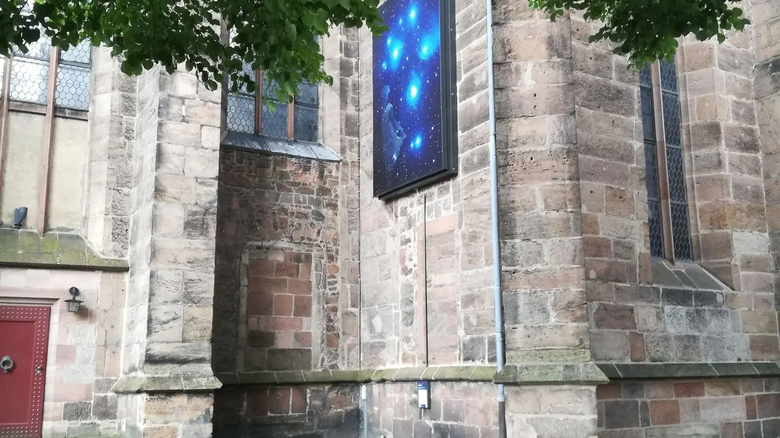 Über die Stadt verteilen sich verschiedene Statuen oder Installationen zu den bekannten Grimm-Märchen. Besonders gut gefällt uns die Station zu den Sterntalern. Im Märchen wird ein armes, aber sehr freundliches Mädchen letztlich mit einem Talerregen von den Sternen beschenkt. Diese Szene wird in Marburg an der Wand einer Kirche mithilfe von Licht dargestellt.