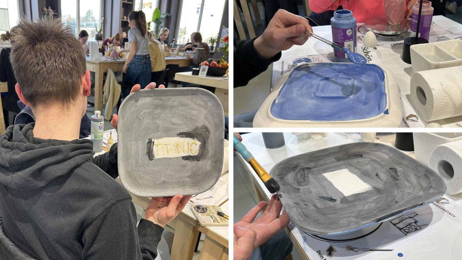 Mit Blau stellt Kilian das Meer unten auf seinem Titanic-Teller dar. Das Schwarz oben steht für den Rumpf des Schiffes