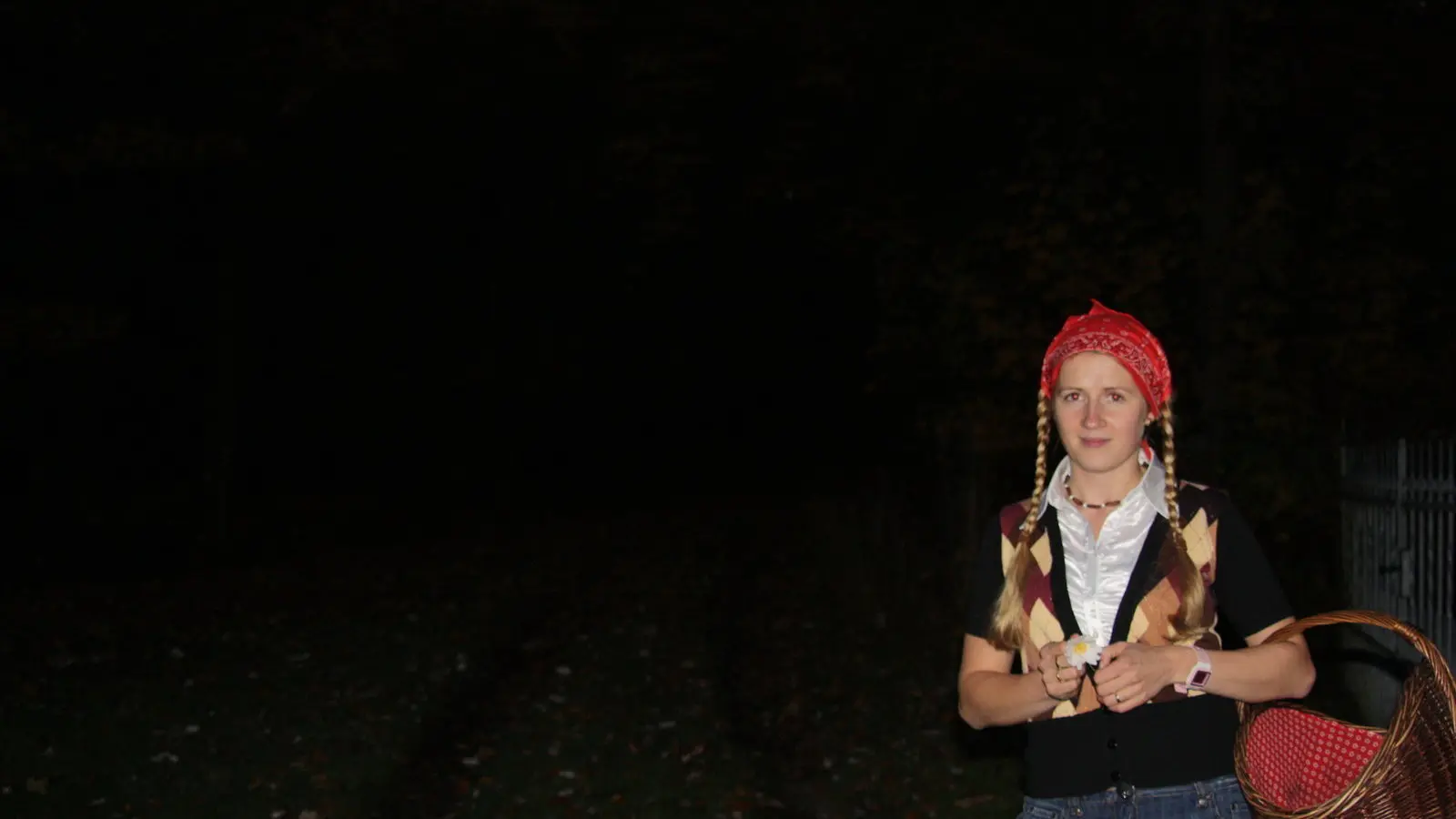 Langsam wird es düster und wir fahren in den Wald. Damit meine ich nicht zwei, drei Bäume. Wir sind in einen echten Wald mit einem fast echten Hexenhäuschen gelandet. Rot-Zöpfchen ist als erstes dran. Trällernd und Blumen pflückend hüpfe ich mit meinem Körbchen um das Hexenhaus herum. Der vorbeilaufende Fußgänger traut seinen Augen nicht. Sicher glaubt er jetzt, das echte Rotkäppchen gesehen zu haben. Schön, wenn man im Alter wieder an Märchen glaubt...