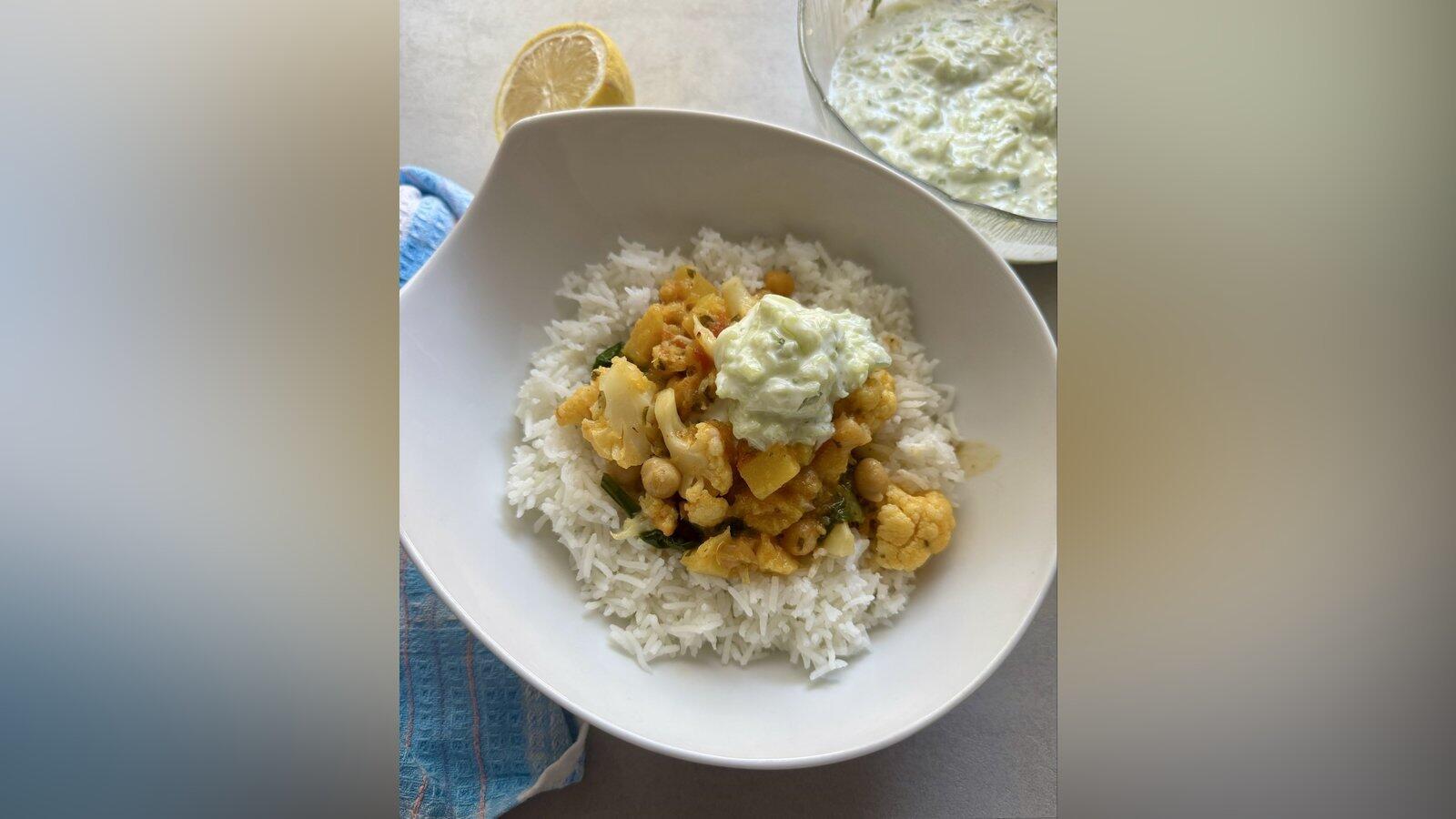 „Gemüsecurry mit Reis und Joghurt-Gurken-Dip“: ein aufwendiges, aber feines Gericht mit viel Gemüse und einem leckeren Dip
