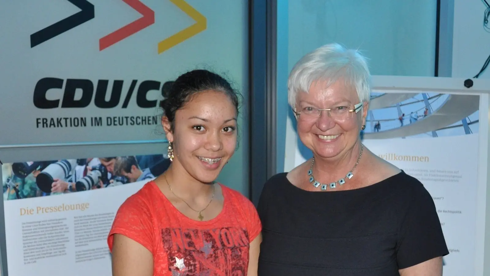 Über der Fraktionsebene erstreckt sich die Dachterrasse. Von dort aus gelangt man in die Kuppel, die einen Durchmesser von 40 Metern hat und einen Blick von 47 Meter Höhe über Berlin verschafft. In der Mitte der Kuppel ist eine Lichtsäule, die von oben bis nach unten reicht. Doch weder Plenarsaal noch Kuppel faszinierten mich so sehr wie das Treffen mit Gerda Hasselfeldt. Ich war den ganzen Nachmittag total gespannt auf sie. Denn sie ist eine ehemalige Schülerin des Ursulinen-Gymnasiums in Straubing. Sie hielt in der Presselounge einen interessanten Vortrag über "Bayern in Berlin", erklärte ihre Arbeitsweise und wie Bayern finanziell und wirtschaftlich mit Berlin zusammenarbeitet. Ferner ging es um das Kindergeld und die Bedeutung der CDU/CSU-Fraktion und die Eurokrise.