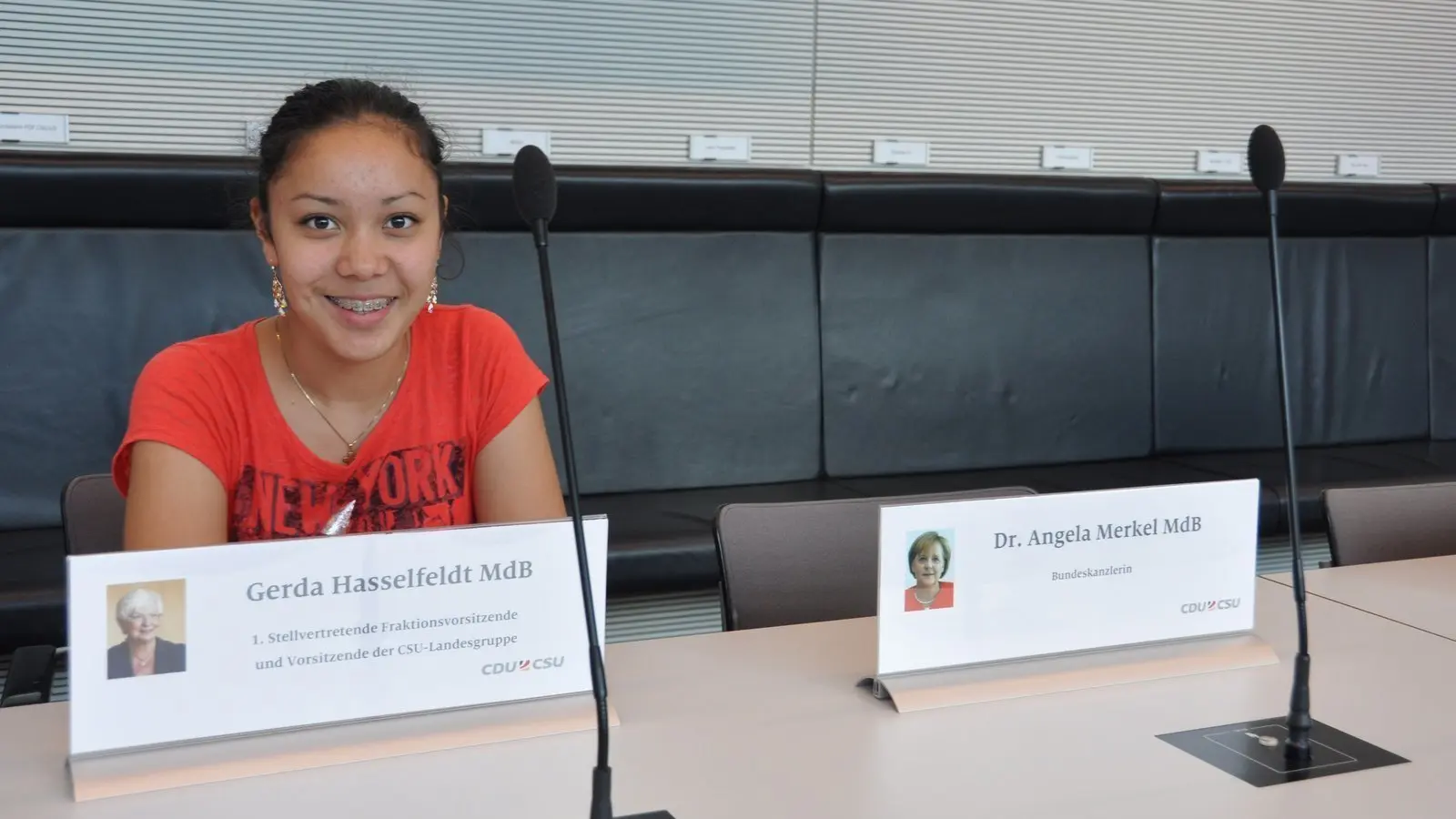 Noch ein weiterer interessanter Punkt war die Fraktionsebene. Dort hatte jede Partei einen eigenen Stand. Für mich stand vor allem die Fraktion CDU/CSU im Mittelpunkt. Im eigenen Sitzungssaal der CDU/CSU konnte ich mich dann auf die Plätze von Angela Merkel und Gerda Hasselfeldt setzen, was mir wahnsinnig Spaß machte. Das Beste des ganzen Besuchs im Reichstagsgebäude war natürlich ein Rundgang in der Kuppel, die der "Publikumsmagnet" war.
