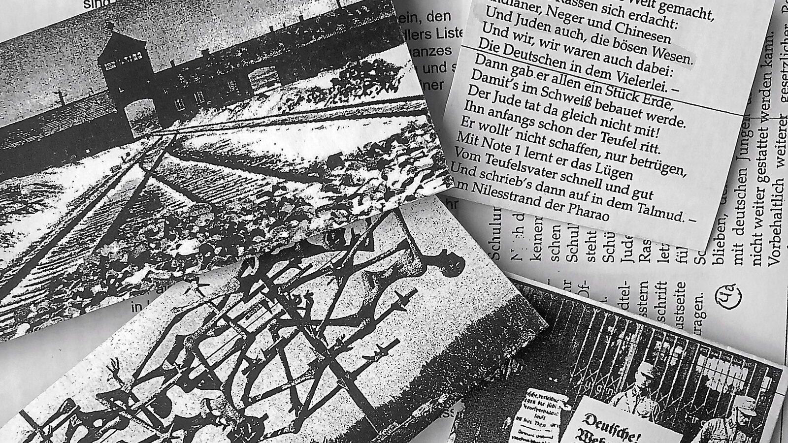 Unterrichtsmaterial in der Religionsstunde (von links oben im Uhrzeigersinn): KZ Auschwitz-Birkenau, rassistisches Kindergedicht, Mann zur NS-Zeit mit einem Schild: "Deutsche! Wehrt euch! Kauft nicht bei Juden!" und ein Holocaust-Denkmal in Jerusalem.