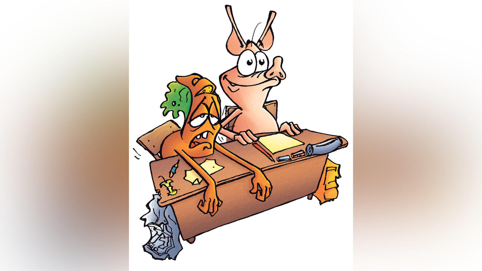 Das kommt alles von unserem Zeichner Werner Härtl, der 1995 zu uns kam und für uns zeichnen wollte. Wir fanden seine Zeichnungen fantastisch. Anfangs hat er witzige Cartoons querbeet geliefert. Mit der Zeit wurde uns klar, dass zentrale Figuren hilfreich und recht schick wären. Brot und Schwein waren geboren. Bis heute wissen wir allerdings nicht, was Werner mit ihnen bezwecken wollte. Wir glauben, die beiden Figuren dienen als Analogie der beiden Gründer, also stehen für Andy und mich. Andy wäre demnach das Schwein, weil er immer schon ein bisschen fester war, ich das Brot.